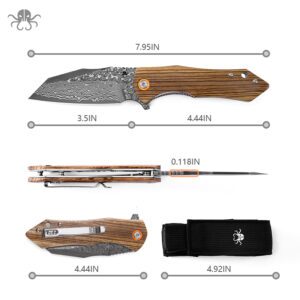 Klaken Knives – J338-ZW-DAM – Askael – Folding Knife – Damascus Wharncliffe – Carbon Fiber – Wood