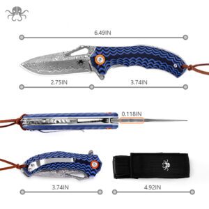Klaken Knives – J345-BL-DAM – Tideborn – Folding Knife – Damascus Damascus Spear Point – G10 – Blue