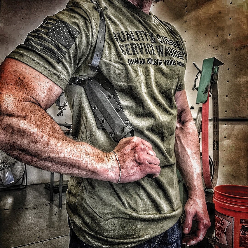 The Bastinelli Creations BAS211 Leather Shoulder Holster, a meticulously crafted accessory by Atelier Écaille de Dragon and Bastien Coves. This adjustable holster is designed to seamlessly accommodate most Bastinelli fixed blades with kydex sheaths, as well as select models from other renowned brands. The fusion of style and functionality makes it a standout choice for discerning individuals seeking a reliable and versatile carrying solution. Crafted from high-quality leather, this tactical holster offers a sophisticated blend of durability and aesthetics. The user has the flexibility to choose between right or left-handed carry, ensuring a personalized and comfortable experience. The thoughtful design caters to the needs of knife enthusiasts who appreciate both form and function in their gear.
