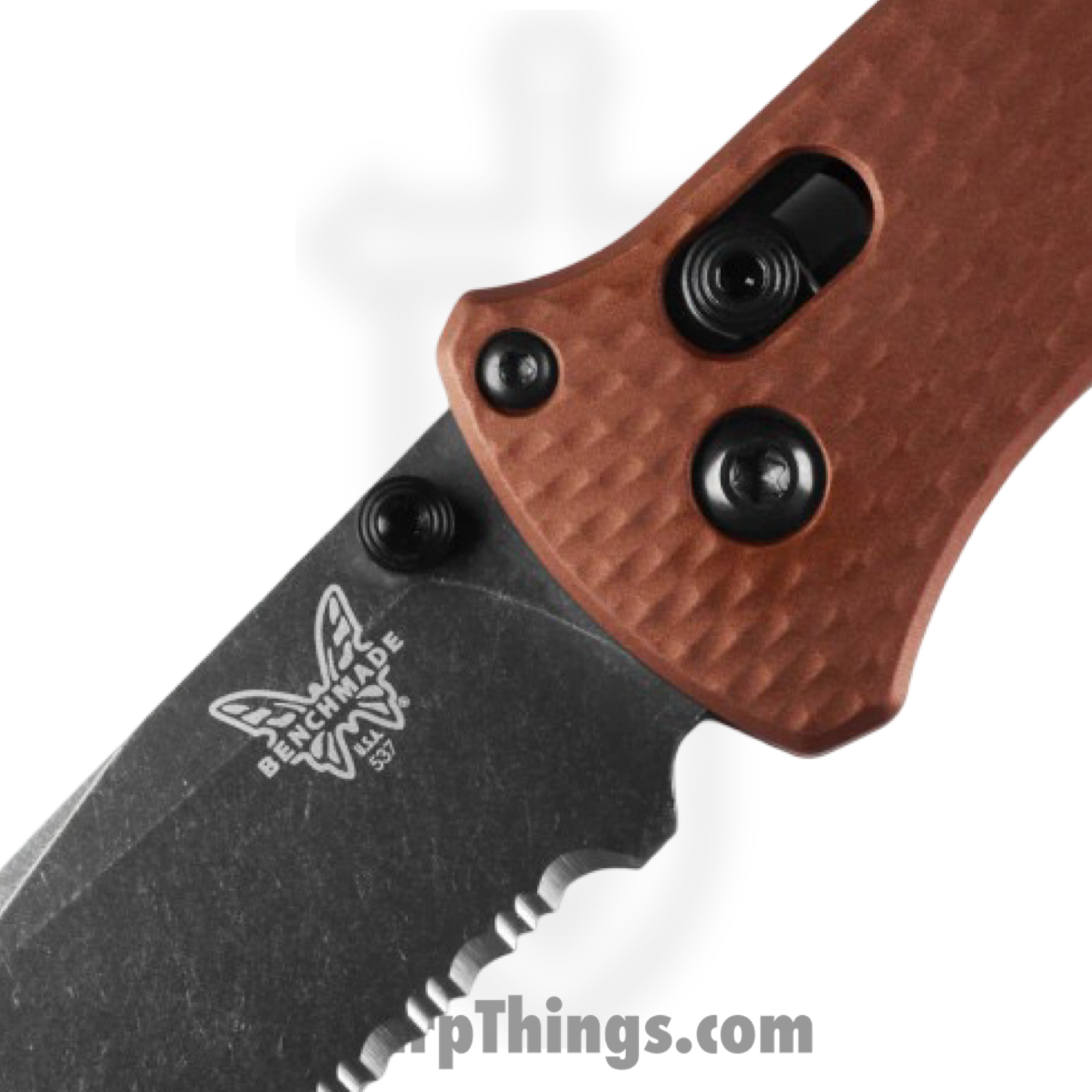 The Benchmade 537SBK-07 Bailout adds a partially serrated edge to the premium MagnaCut lineup, giving you even more versatility in a featherweight tactical design. Featuring a Blackwash tanto blade and burnt copper anodized aluminum scales, this version is purpose-built for those who demand power, utility, and eye-catching aesthetics.