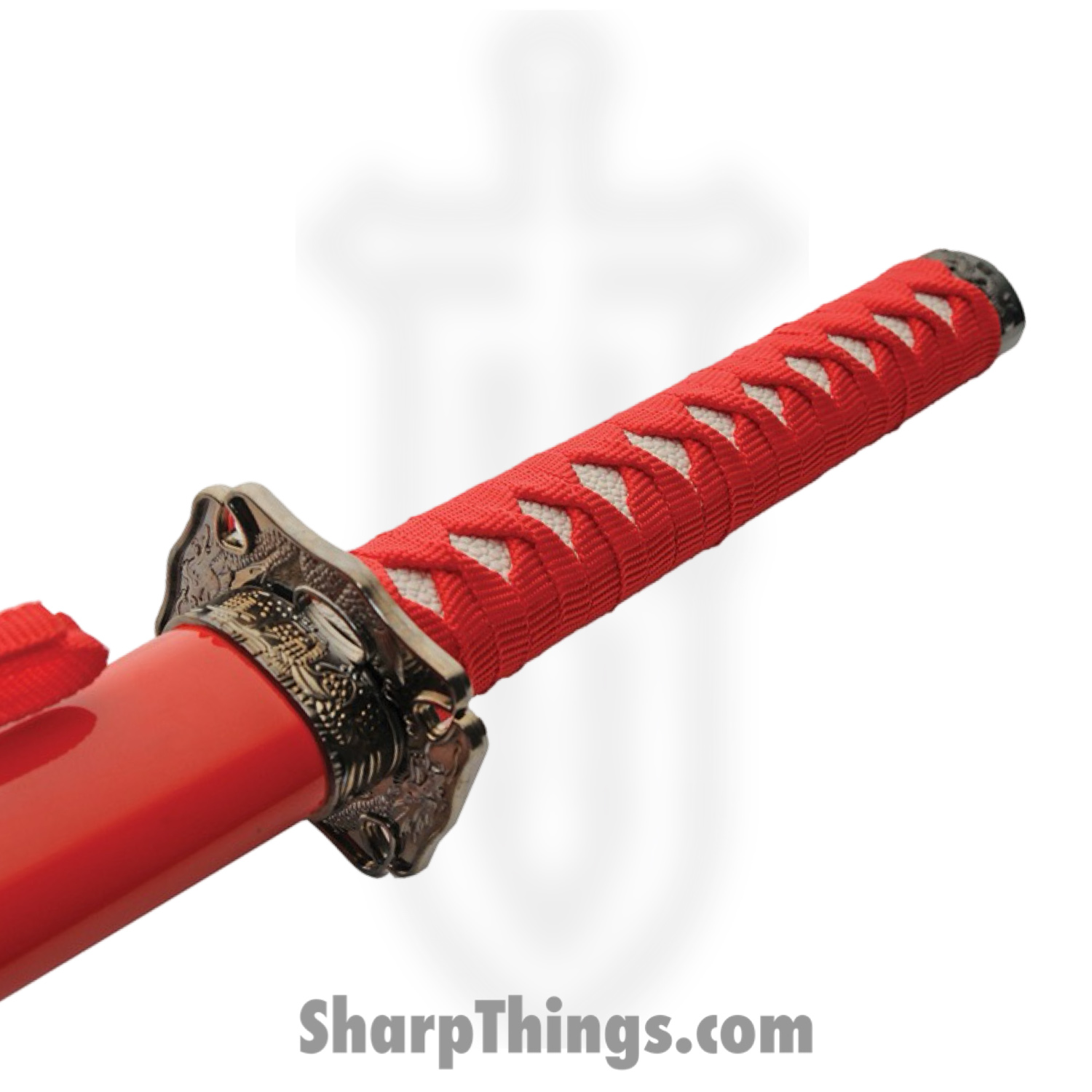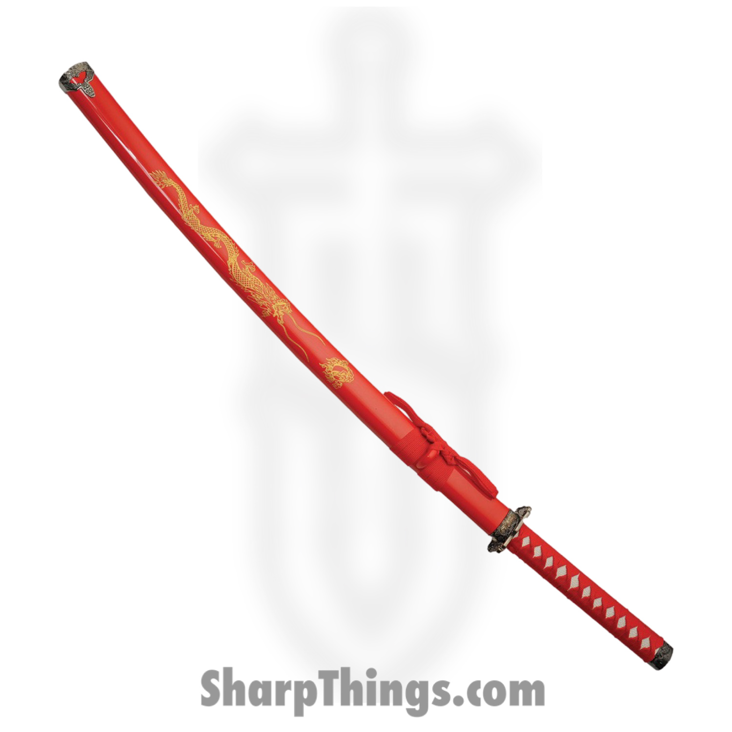 Elevate your collection with the exquisite CN927030RD Gold Dragon Samurai Sword. This stunning blade masterfully blends traditional design with modern craftsmanship, making it a remarkable piece for collectors and enthusiasts alike. Whether displayed proudly or used as a decorative centerpiece, this sword captures the timeless elegance of samurai culture with a striking red and gold aesthetic. The sword measures an impressive 39.5 inches overall, with a razor-sharp 27-inch satin finish carbon steel blade. The blade’s carbon steel construction ensures durability and strength, offering both practicality and visual appeal. Complementing the blade is a vibrant red cord-wrapped handle, providing an ergonomic grip for comfortable handling and a touch of traditional artistry. Adding to its unique character, the ABS tsuba is etched with an intricate dragon design, symbolizing strength and wisdom. The matching red ABS scabbard ensures safe storage while maintaining the sword’s cohesive, eye-catching style.