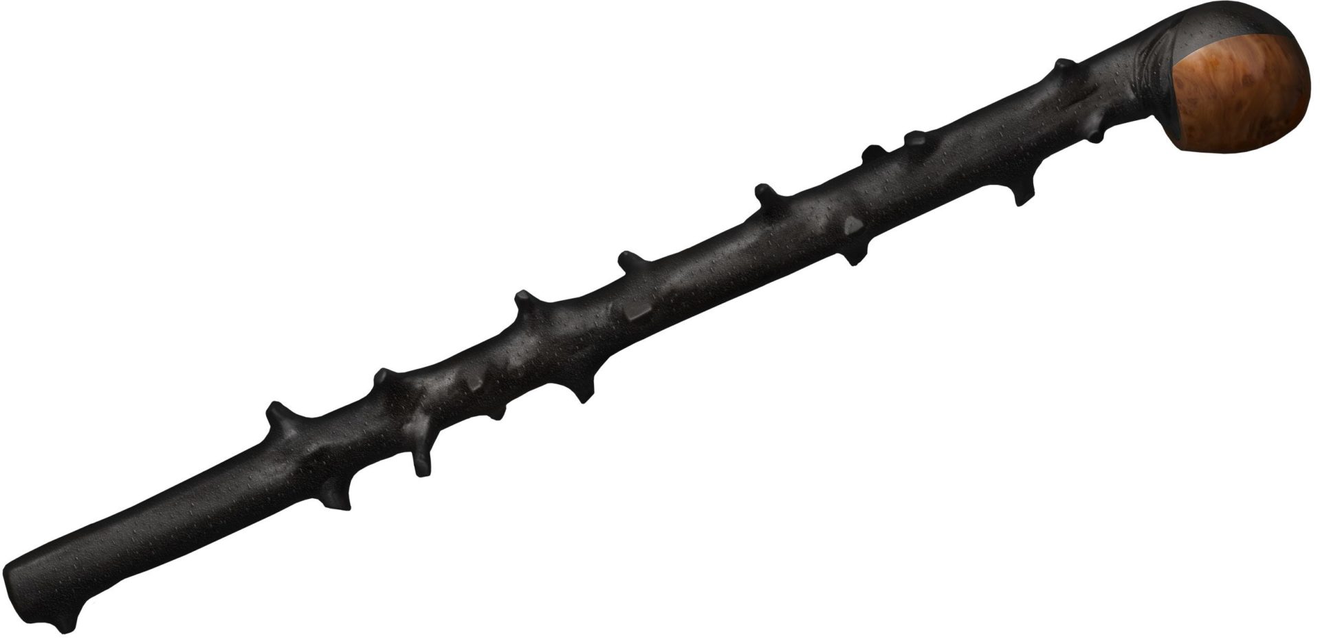 With a handsome bark-like wood texture and raised “clipped thorns” on the shaft, and a highly polished faux-wood head, this good looking stick will be sure to turn heads – whether it is carried under your arm at a historical re-enactment event, or simply hung by the door to greet uninvited guests.