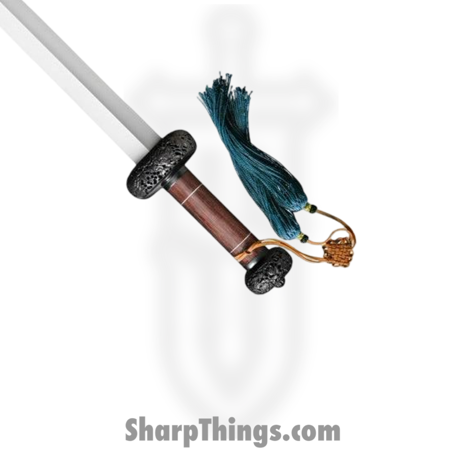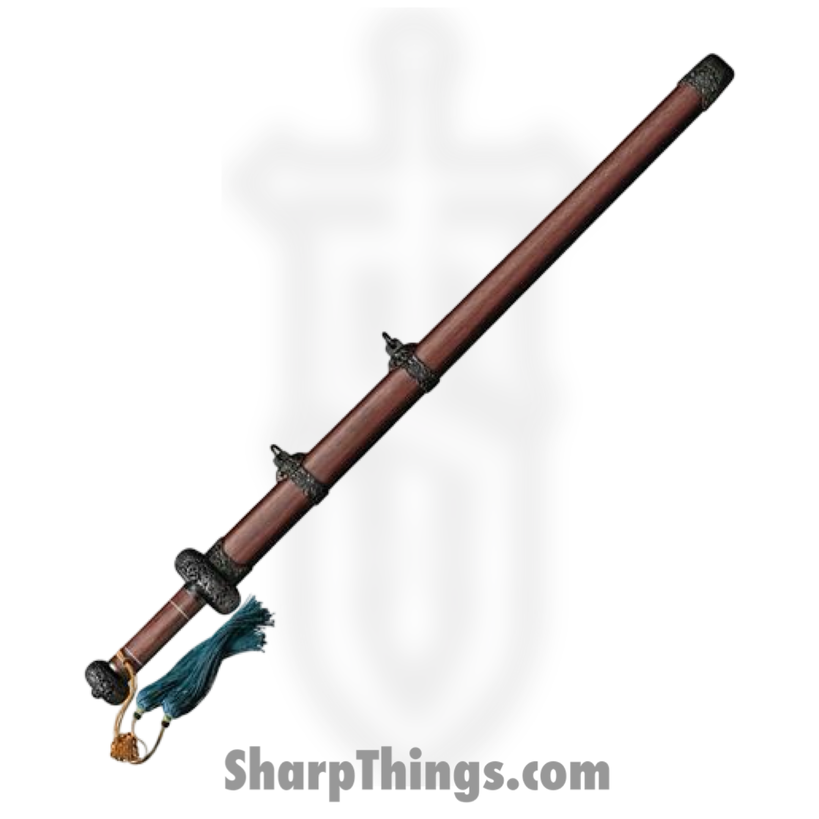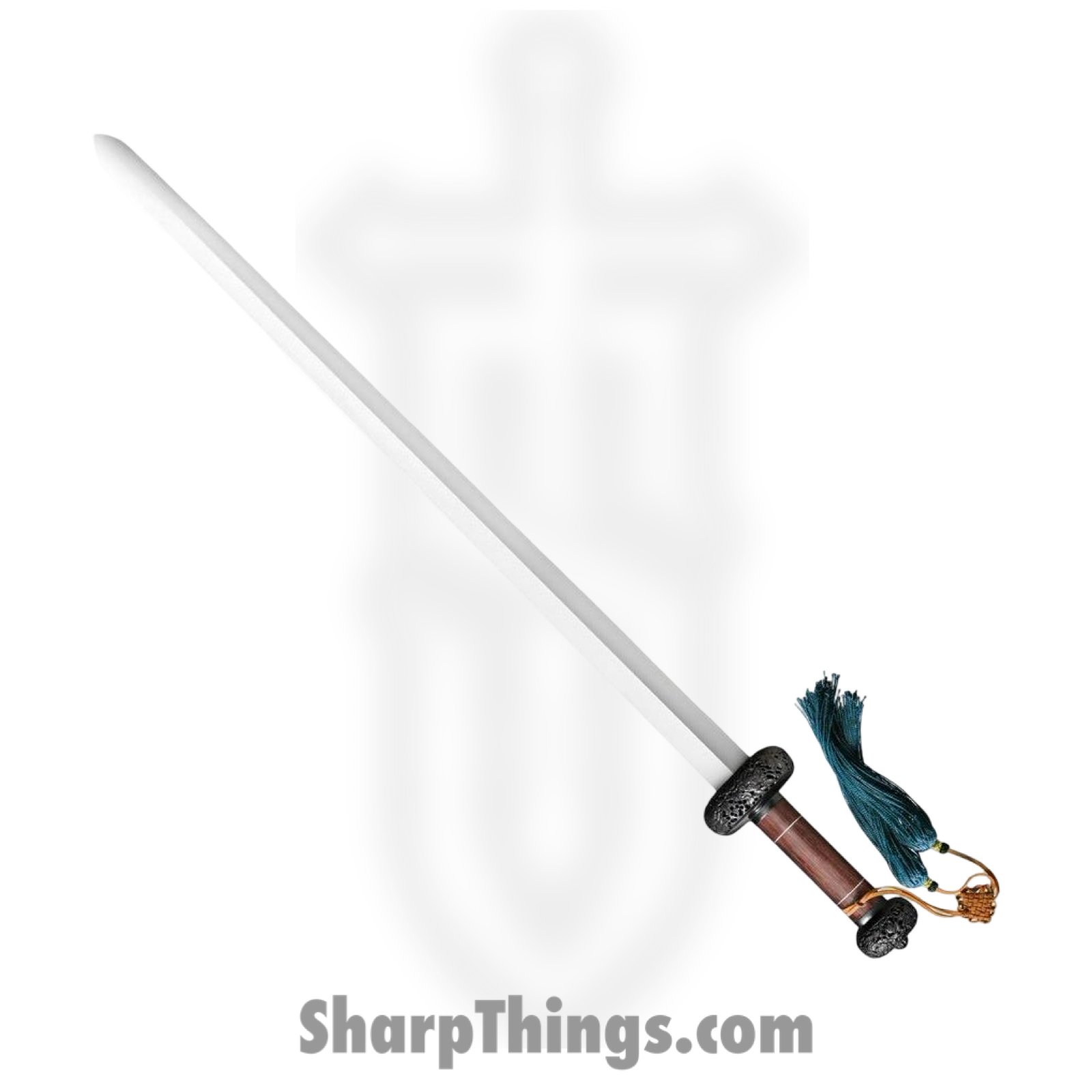 Experience a true blend of traditional Chinese craftsmanship and modern blade quality with the Cold Steel Battle Gim, model CS88FG. Designed to echo the elegance and ferocity of ancient Chinese warriors, this weapon is both a collector’s masterpiece and a fully functional combat-ready sword. The Battle Gim features a double-edged Damascus steel blade, measuring 30 inches in length with a striking satin finish. This blade offers both superior cutting capability and eye-catching aesthetics, thanks to the characteristic wave patterns of Damascus construction. Its 37.125-inch overall length provides a commanding presence, perfect for display, martial arts practice, or historical reenactments. A rich rosewood handle adds a classic, elegant touch, fitted with a traditional double tassel that enhances the sword’s visual balance. The blackened iron guard and pommel are detailed with a delicate filigree of Chinese Peony motifs, symbolizing honor, wealth, and prosperity. Every component, from the blade to the fittings, exudes an air of nobility and cultural significance. Housed in a rosewood scabbard adorned with matching blackened iron accents on the chape, throat, and ring mounts, this sword is both well-protected and beautifully presented. A navy-blue cloth sleeve is also included for safe storage. Whether displayed or wielded, the Cold Steel CS88FG Battle Gim stands as a testament to high-quality artistry and historical appreciation.