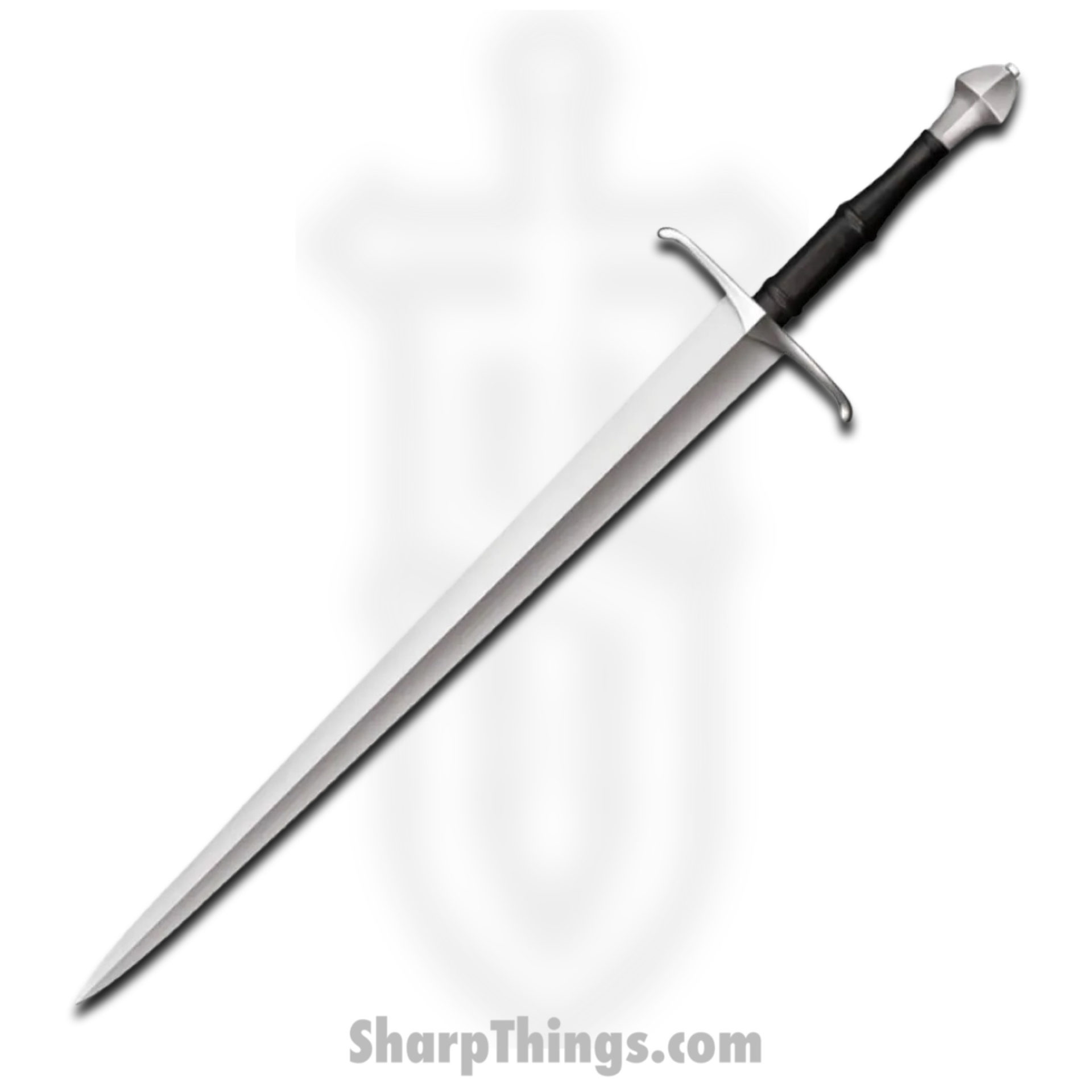 The Cold Steel CS88HS Competition Cutting Sword presents a remarkable fusion of tradition and innovation, designed to meet the demands of modern Western sword competitions. Inspired by the legacy of Japanese sword cutting contests, Cold Steel has crafted this sword to excel in competitions involving soft targets like rope, mailing tubes, and tatami mats. The blade, reminiscent of the Arbedo style, is meticulously hand forged from 1050 high carbon steel, ensuring exceptional durability and edge retention. With a thin, wide, double-edged profile and a hard spring temper, this sword delivers unparalleled cutting performance. Crafted for optimal control and leverage, the Competition Cutting Sword boasts a substantial leather-covered wood handle, accommodating one or both hands comfortably. The simple yet effective double quillon steel guard ensures finger protection and deflects opposing blades during intense competitions. To maintain balance, the sword is equipped with an attractive flared, lozenge-shaped steel pommel. For storage and transport, it comes encased in a thick and sturdy black leather scabbard with matching steel throat and chape.