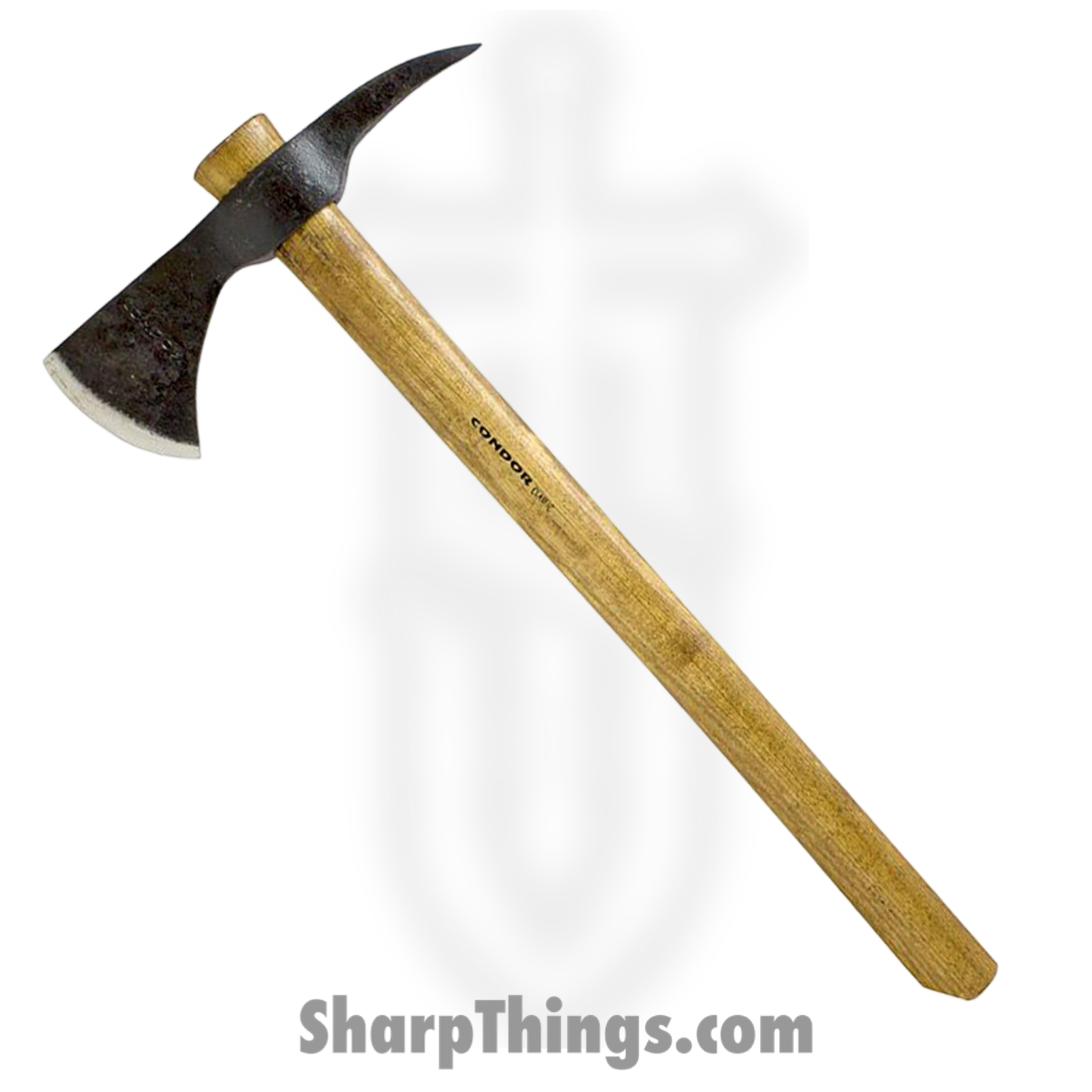 The Condor Tool & Knife Indian Spike Tomahawk, model CTK3916-1.8, is a robust, battle-ready tool built for users who demand uncompromising reliability, functionality, and craftsmanship. Inspired by traditional indigenous weaponry and upgraded with modern materials, this tomahawk is equally effective in field work, survival scenarios, breaching tasks, or display collections. The 1060 high carbon steel head measures 9.18″ in length with a 2.96″ cutting edge, heat-treated for toughness and durability. The forged finish on the head delivers not only a rugged aesthetic but also superior resistance to wear and corrosion. Its aggressive spike on the opposite end of the cutting edge adds another layer of practicality—perfect for puncturing, prying, or defensive use. This dual-purpose configuration makes the Indian Spike Tomahawk far more versatile than standard chopping tools. The 19.18″ handle is crafted from premium American hickory, renowned for its shock-absorbing strength and natural resilience. Finished with a burn treatment, the handle is both visually striking and provides enhanced texture and grip. Whether you’re operating in wet conditions or delivering repeated blows, the ergonomic handle ensures a secure hold and long-lasting comfort during use. Weighing just over 24 ounces, the Indian Spike Tomahawk maintains an ideal balance between weight and control. It’s light enough for fluid movement and quick strikes, yet substantial enough for heavy-duty cutting and splitting. The included handcrafted leather sheath, designed with a belt loop for easy carry, protects the edge while offering traditional styling that complements the tomahawk’s overall aesthetic. Each element of this tool reflects Condor’s dedication to producing high-performance blades rooted in heritage and built for today’s toughest tasks. Whether you’re a woodsman, tactical operator, or historical enthusiast, the CTK3916-1.8 is a worthy addition to your arsenal.