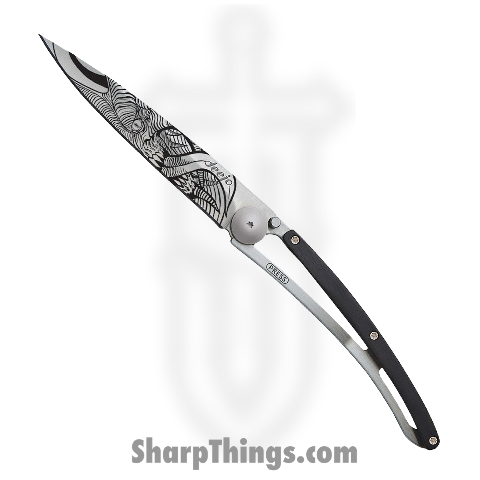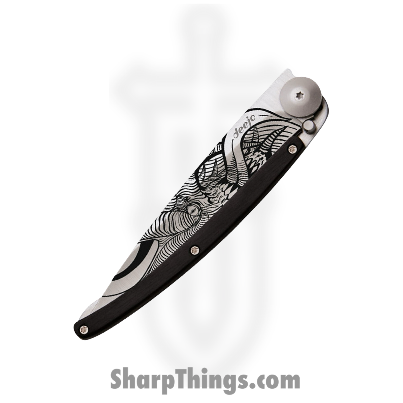Deejo – DEE1CB028 – Tattoo Demon 37g – Folding Knife – 420 SS Coated Drop Point – Ebony Wood SS – Black
