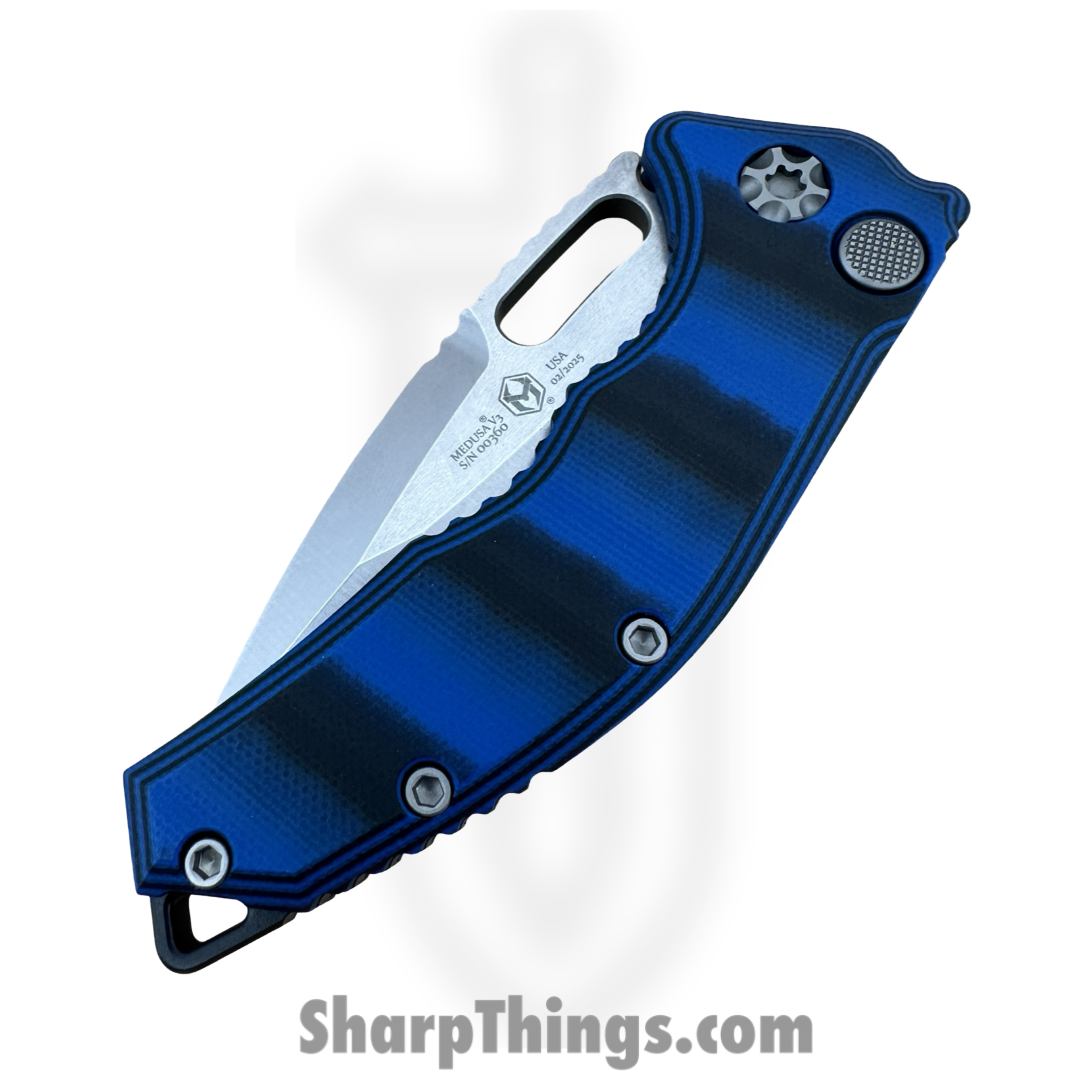 The handle is crafted from blue G10, known for its high strength, lightweight properties, and superior grip. The textured surface of the G10 provides a secure, non-slip hold, ensuring that the knife feels comfortable and stable in your hand during use. The overall design of the Medusa combines ergonomics and aesthetic appeal, making it both a high-functioning tool and an eye-catching addition to your collection.