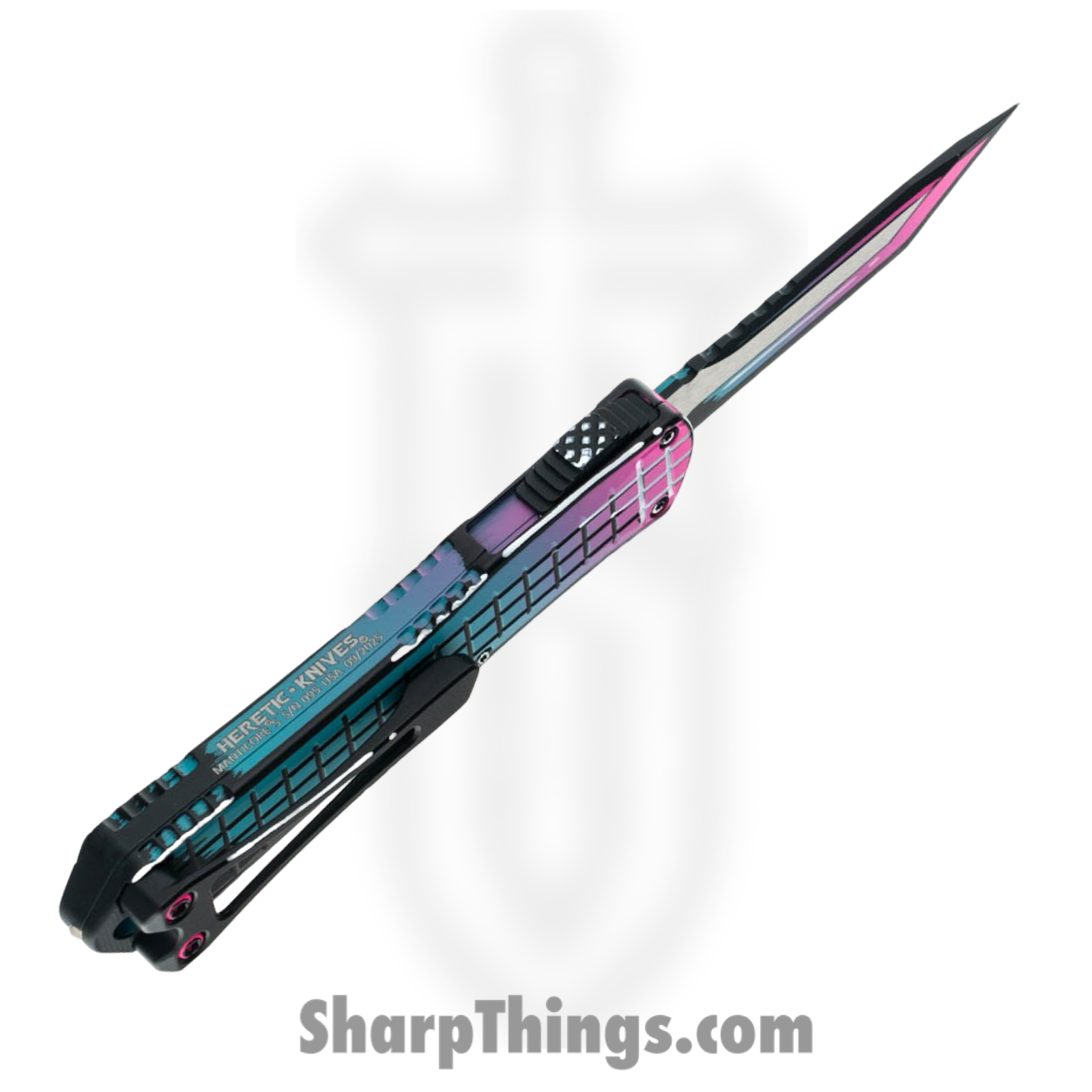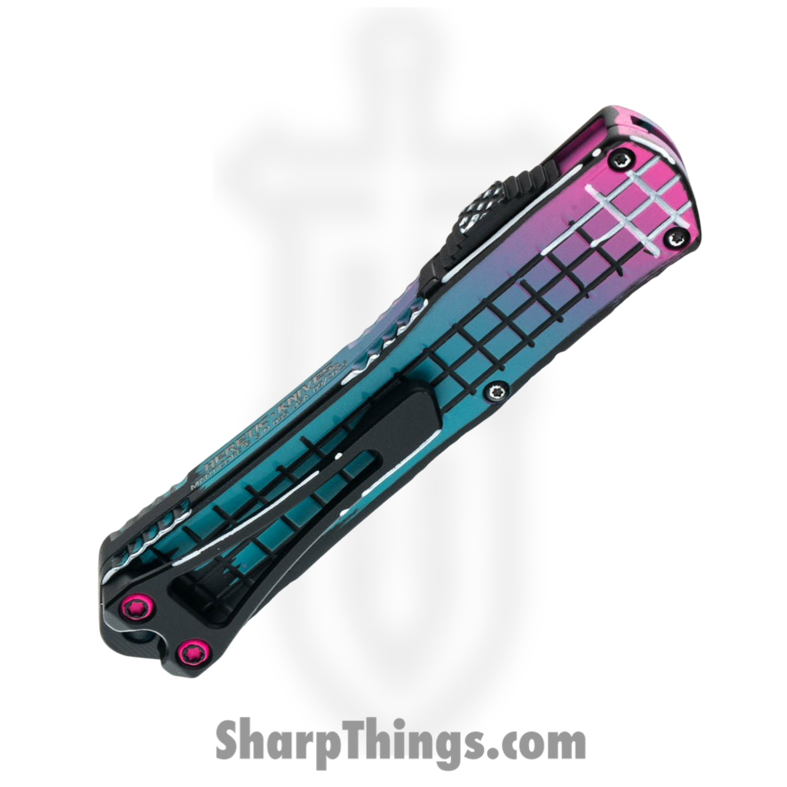 Heretic Knives – H023F-CS-MV – Manticore S – OTF Auto – CPM MagnaCut Coated Tanto – Aluminum Cel Shading – Miami Vice