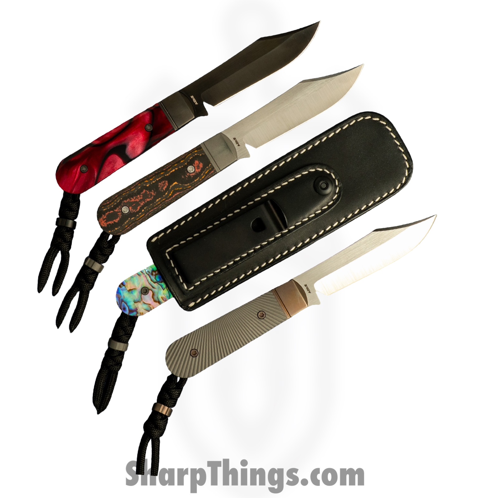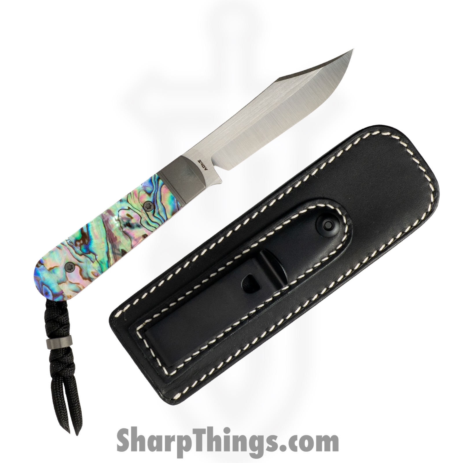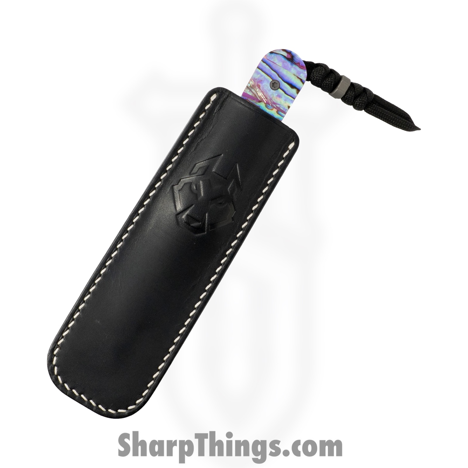 The Abalone scales elevate the knife into a class of its own, offering a shimmering, iridescent look that changes with the light. Dark blast titanium bolsters and liners provide rigidity and contrast, while the matching titanium hardware ties the build together with cohesive luxury. A custom snake-knot paracord lanyard and dark blast titanium bead add grip versatility and a unique aesthetic touch. Even the included sheath continues that attention to detail — a finely constructed ambidextrous black leather sheath with white stitching and a stout clip for belt, waistband, or pocket carry.
