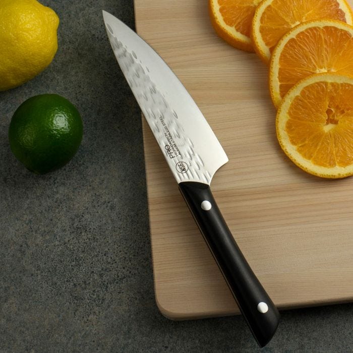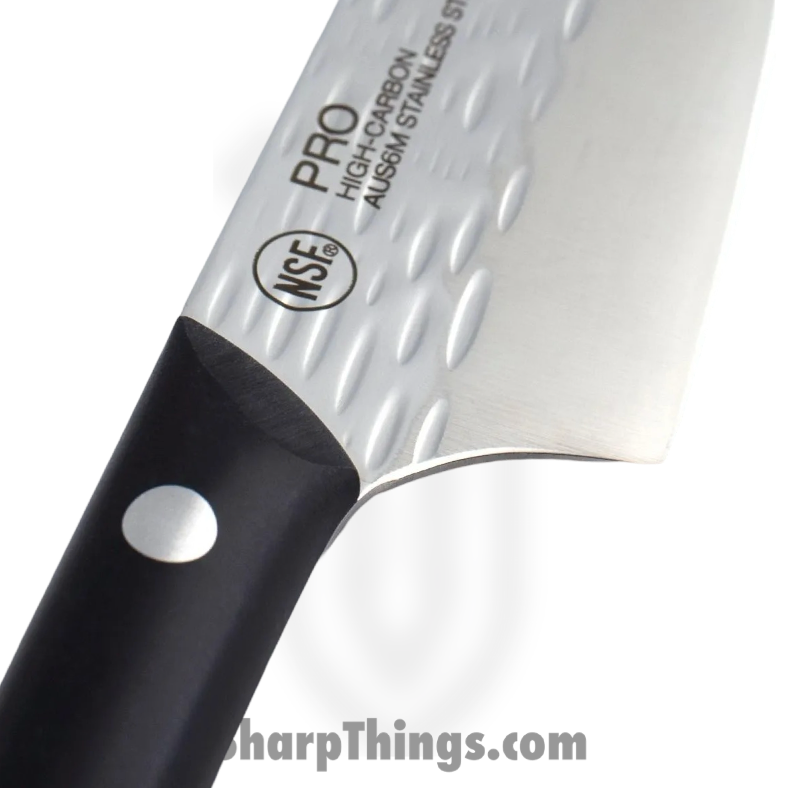 The Kai HT7066 Pro Chef 8″ Knife is a versatile and indispensable tool for any kitchen. Designed to handle a wide range of culinary tasks, this chef’s knife combines functionality with durability, making it a must-have in your kitchen arsenal. Crafted with precision, the Pro Chef 8″ Knife features an 8-inch blade made from imported Japanese AUS6M stainless steel. This high-quality steel is known for its excellent corrosion and wear resistance, ensuring that the knife maintains a sharp edge over time. The blade’s hand-sharpened 16° double-bevel edge (32° comprehensive) delivers razor-sharp performance, allowing for effortless slicing, chopping, and dicing. The hammered finish on the blade not only enhances its appearance but also helps food release more easily, preventing sticking. The Pro Chef 8″ Knife is designed for comfort and balance. It features a riveted POM handle, which is ergonomically designed to provide a secure and comfortable grip. The full-tang construction enhances the knife’s strength and balance, making it suitable for both professional and home use. Additionally, this knife is NSF Certified, ensuring its suitability for use in commercial kitchens where hygiene and performance are paramount. Whether you’re slicing vegetables, cutting meats, or preparing fruits, the Pro Chef 8″ Knife is engineered to handle it all with ease. Its versatile blade shape and substantial cutting length make it ideal for a variety of kitchen tasks.
