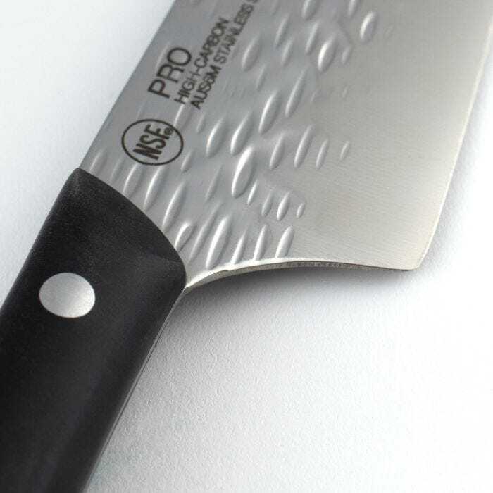 Elevate your culinary skills with the Kai HT7078 Pro Chef’s Knife, a top choice for professional and home cooks who seek precision and versatility in the kitchen. This 10-inch knife is crafted for those who require a longer blade for effortless cutting, slicing, dicing, and chopping. Its extended blade provides enhanced leverage, making it ideal for handling larger foods and reducing the number of strokes needed for tasks like slicing multiple carrots simultaneously. The knife features a striking hammered finish, which not only enhances its aesthetic appeal but also reduces drag, allowing food to release from the blade more easily. This innovative design makes the Kai Pro Chef’s Knife a standout in both home and professional kitchens. The full tang construction and riveted polyoxymethylene (POM) handle contribute to the knife’s robust performance and longevity. The ergonomic handle ensures a secure and comfortable grip, enhancing control and precision during use.