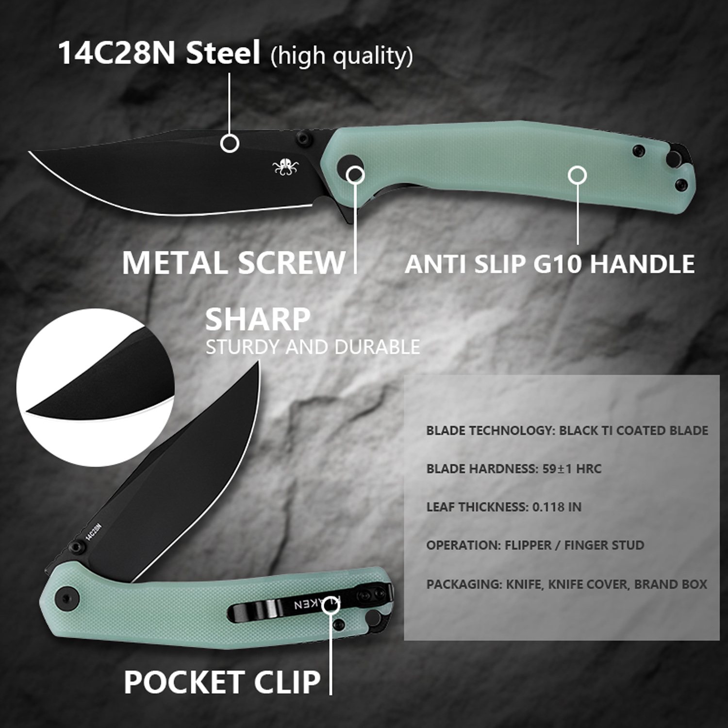 Klaken Knives – J335-JD-BK – The Lancet – Folding Knife – 14C28N Coated Clip Point – G10 – Jade