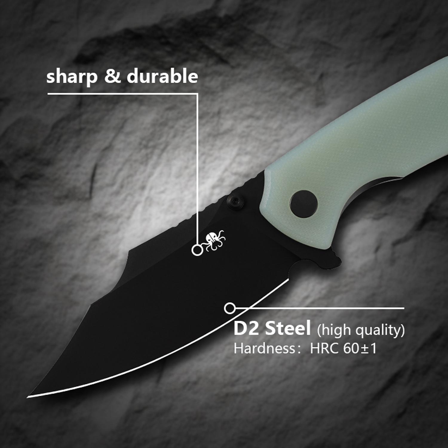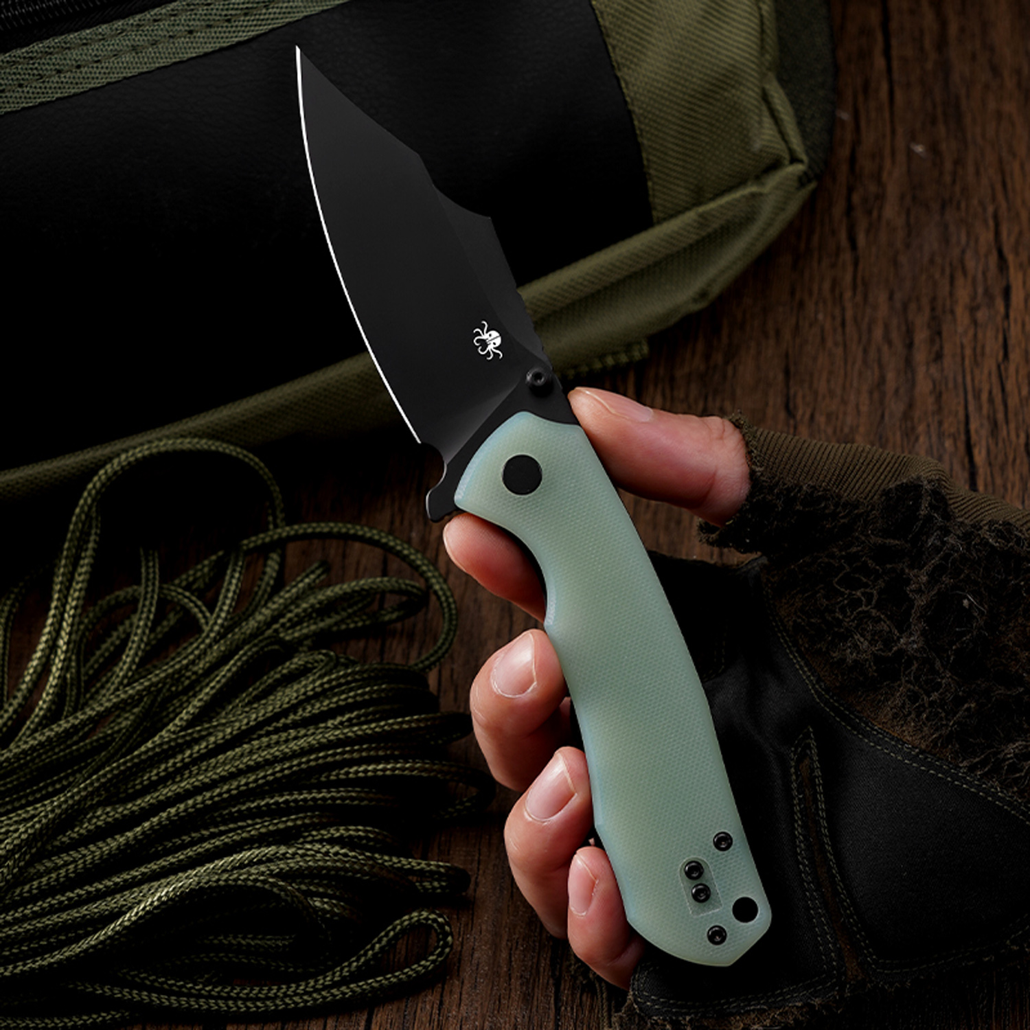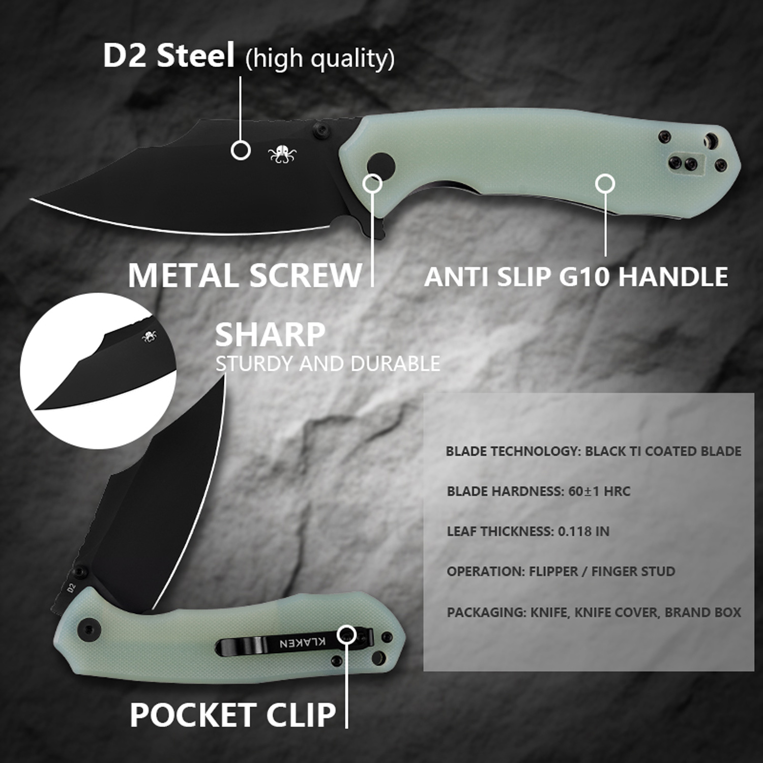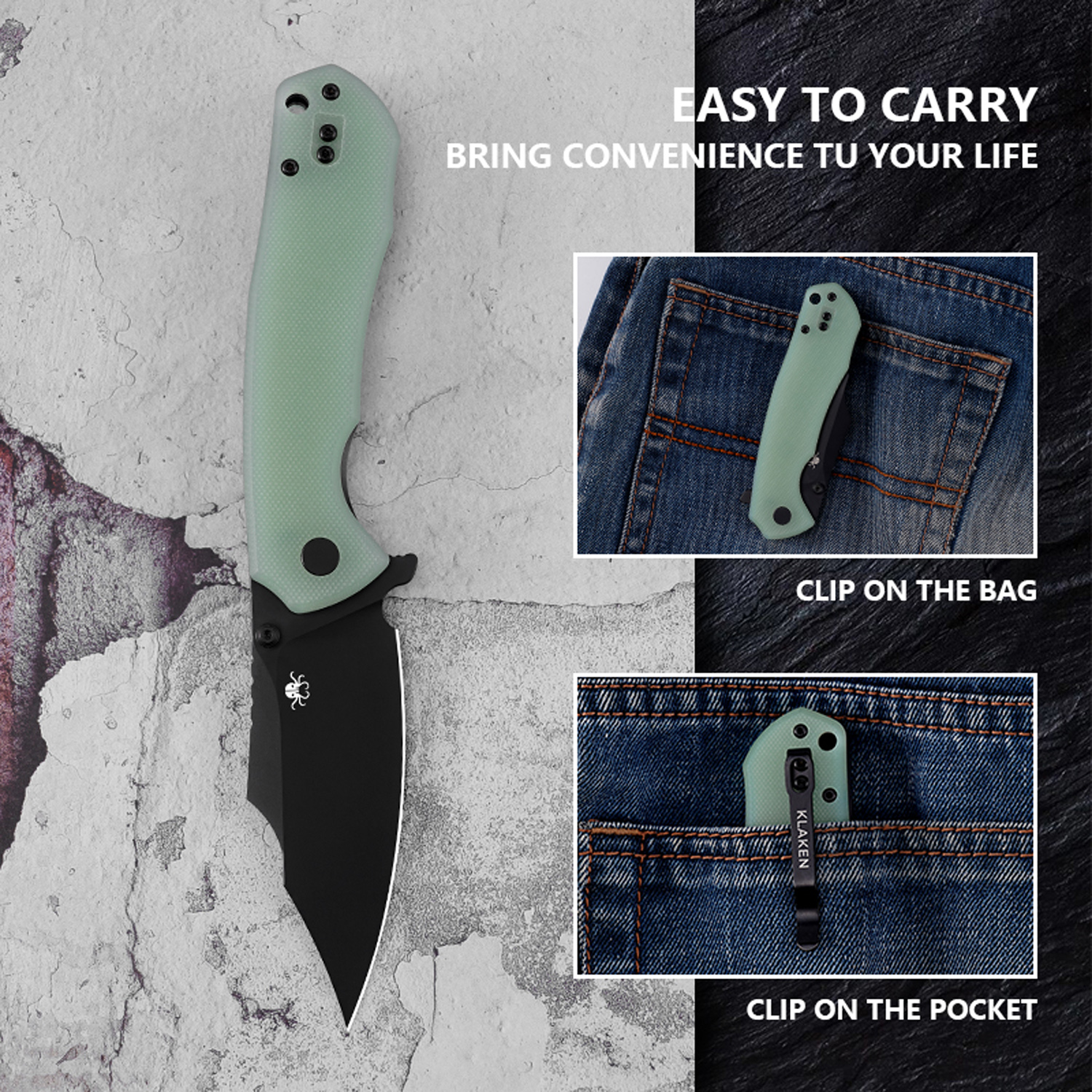 The Klaken Specter K01-JD-BK delivers the same cutting performance and reliability as the black variant while introducing a bold jade G10 handle that stands out without sacrificing practicality. Its 3.42-inch black-coated D2 clip point blade offers an excellent balance of slicing power and tip control, making it an ideal tool for everyday cutting tasks that demand precision. The coated finish reduces glare and adds a layer of corrosion resistance for users who rely on their knives in a variety of environments.