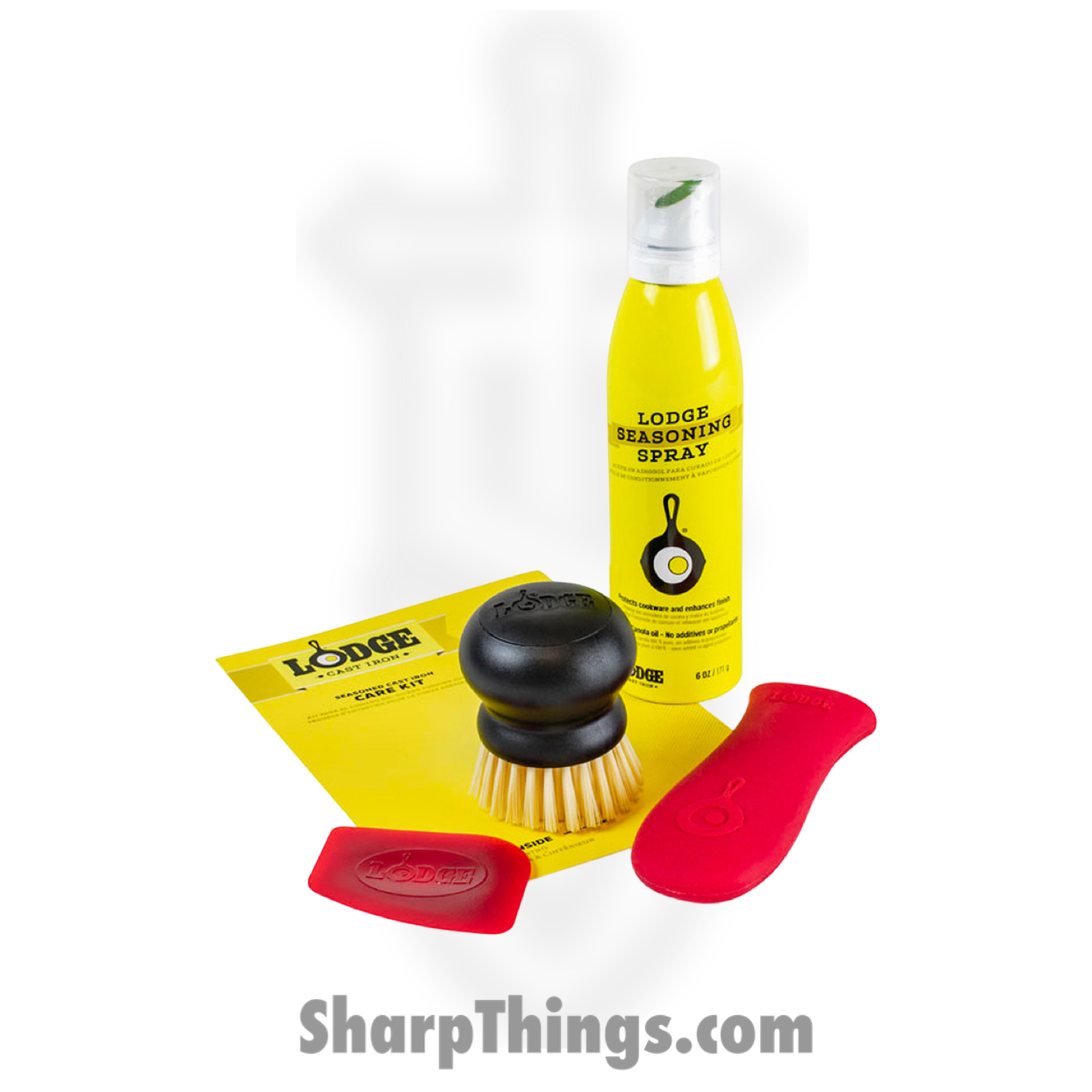 The Lodge Seasoned Cast Iron Care Kit includes all the essentials you need to use and care for your cast iron cookware. Our Seasoning Spray, made of 100% pure vegetable oil with no additives or propellants, protects your cookware and enhances cast iron’s easy-release finish. The aluminum can features adjustable spray settings and an internal pouch to keep oil fresh by preventing exposure to air and light while allowing it to spray without propellants. The rigid, easy-to-clean polycarbonate Pan Scraper is dishwasher safe, won’t collect food particles, and features an assortment of angles to easily clean all the nooks and crannies of your cookware. The Silicone Handle Holder protects hands from heat up to 500° F and is dishwasher safe. The Scrub Brush features nylon bristles to easily clean and preserve your cookware’s finish. Includes 6 Ounce Seasoning Spray, Pan Scraper, Silicone Handle Holder, and Scrub Brush.