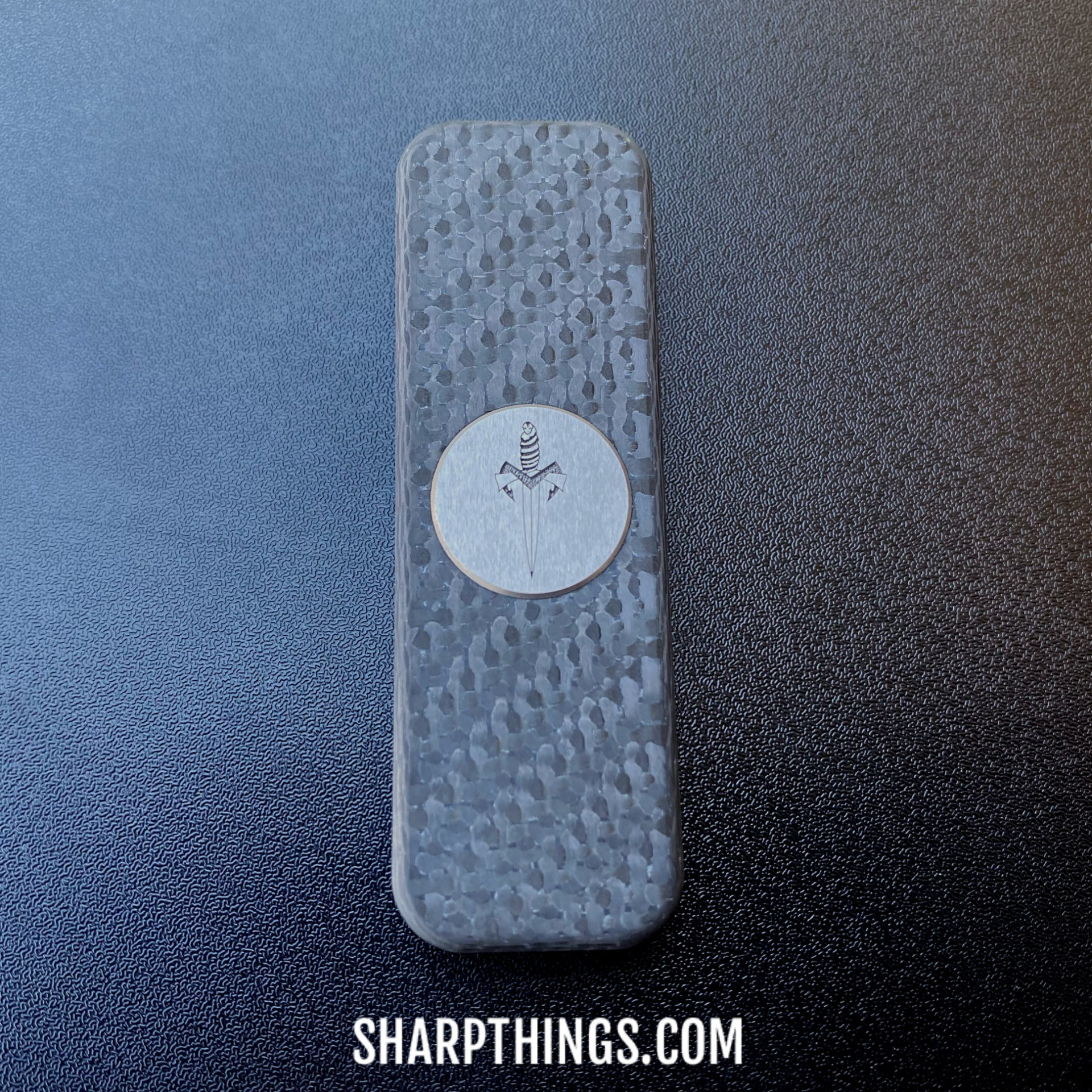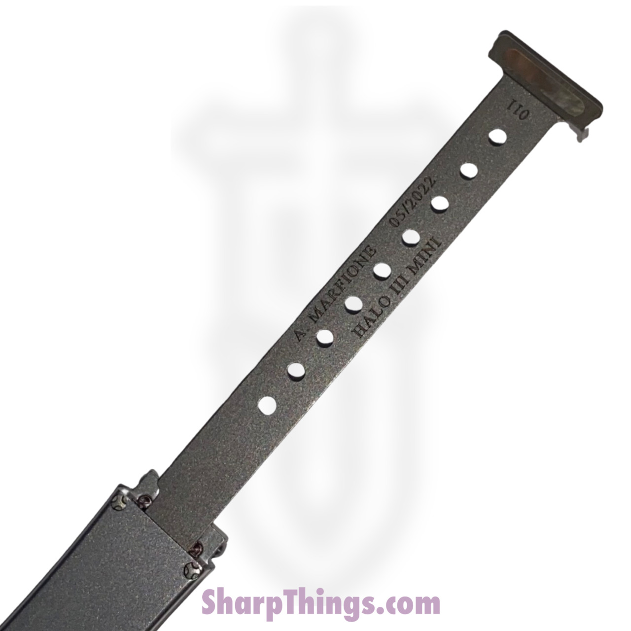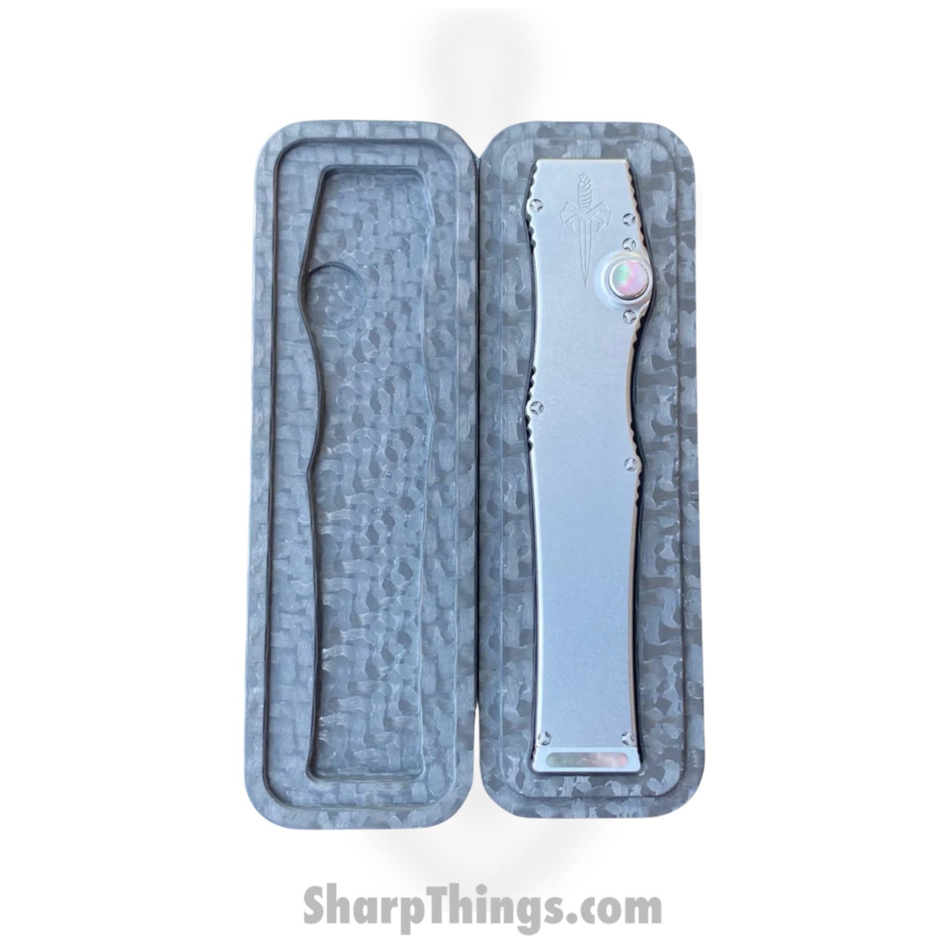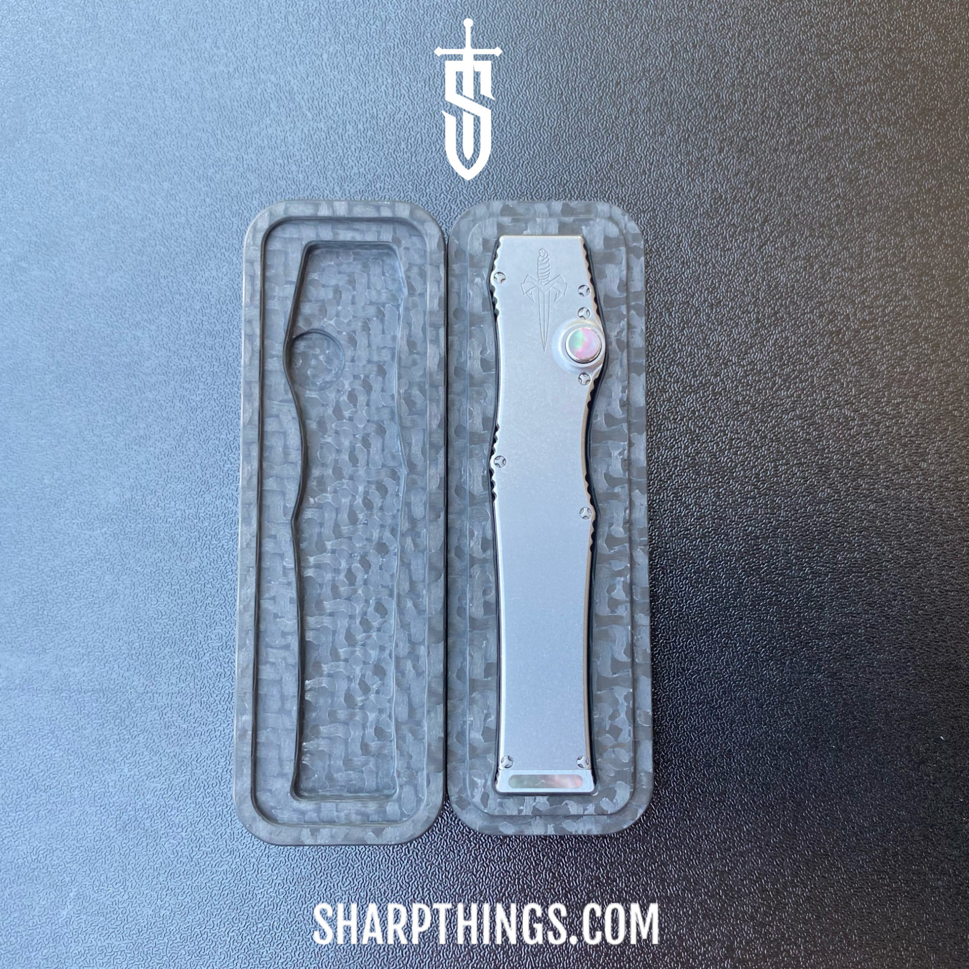 This Mini Halo III OTF includes a Mirror polish M390, Star Ground, tanto blade, Double Vapor Blast 416 Stainless Steel handle, Black Lip Mother of Pearl inlay button and charging handle, double vapor blasted hardware, and it comes in its own custom carbon fiber case with a metal certificate of authenticity. This is an absolutely amazing highly collectible custom and it really gives you an insight into how nice out the front AUTOs, especially ones this small, can be.