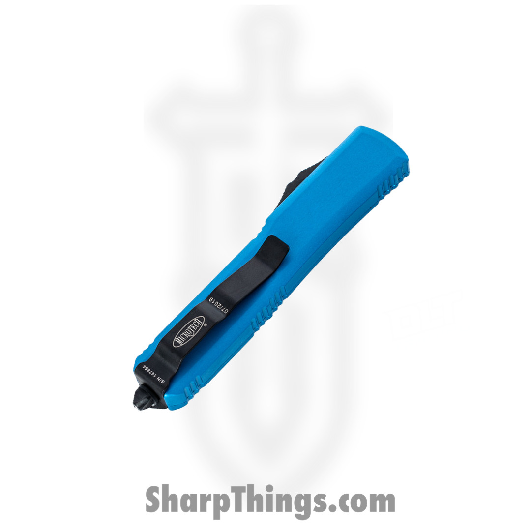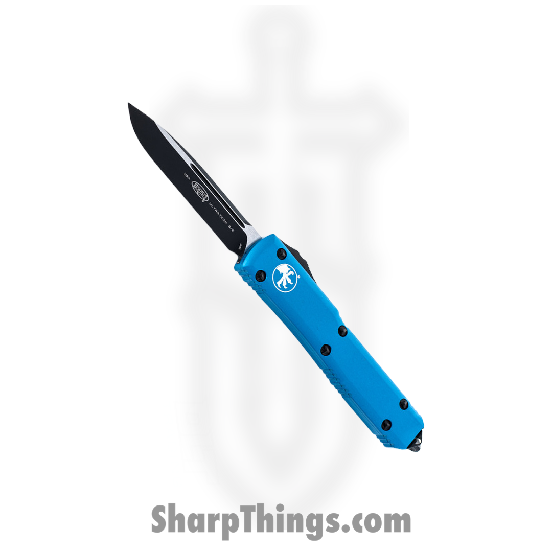 Microtech – 121-1BL – Ultraetch – OTF Auto – Elmax, M390, 204P Two Tone Drop Point – 6061-T6 Aluminum – Blue