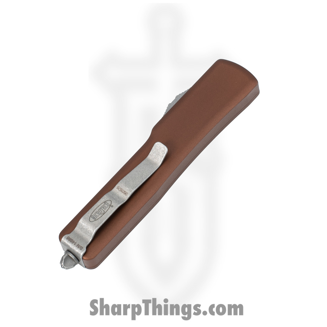 An ultra compact OTF dagger style knife, The Microtech UTX-70 fires in and out automatically via the sliding firing button the the knife’s right side. Super small; less than 6″ overall. This UTX-70 features a tan anodized aluminum handle. The pocket clip and hardware are bead blast finished.