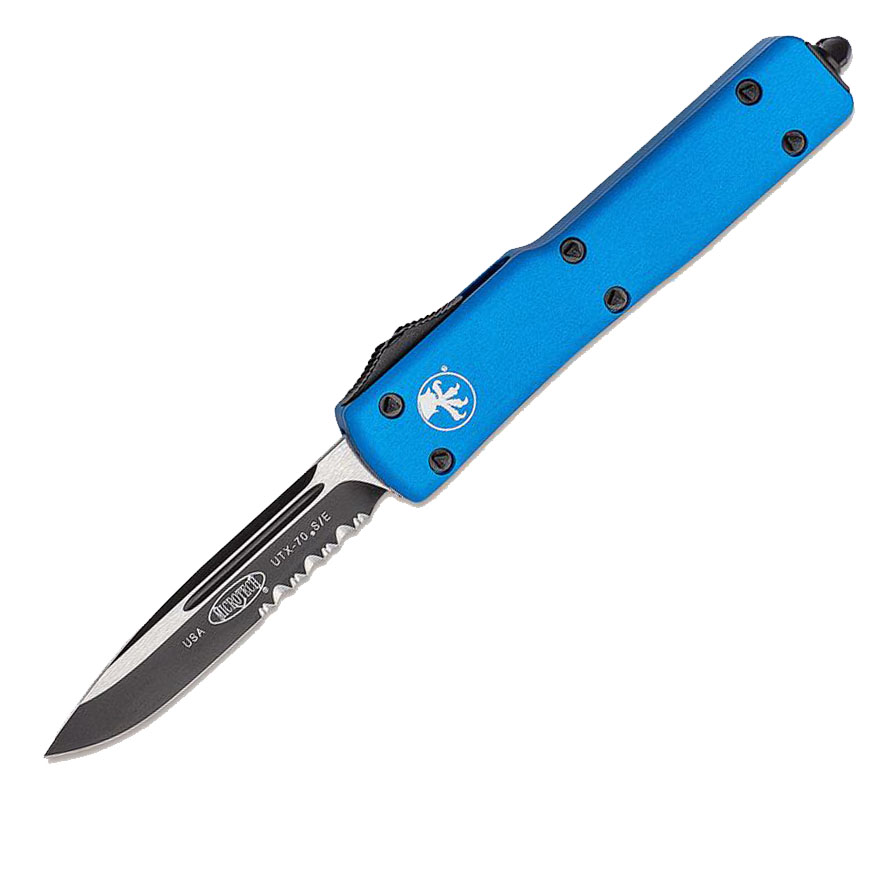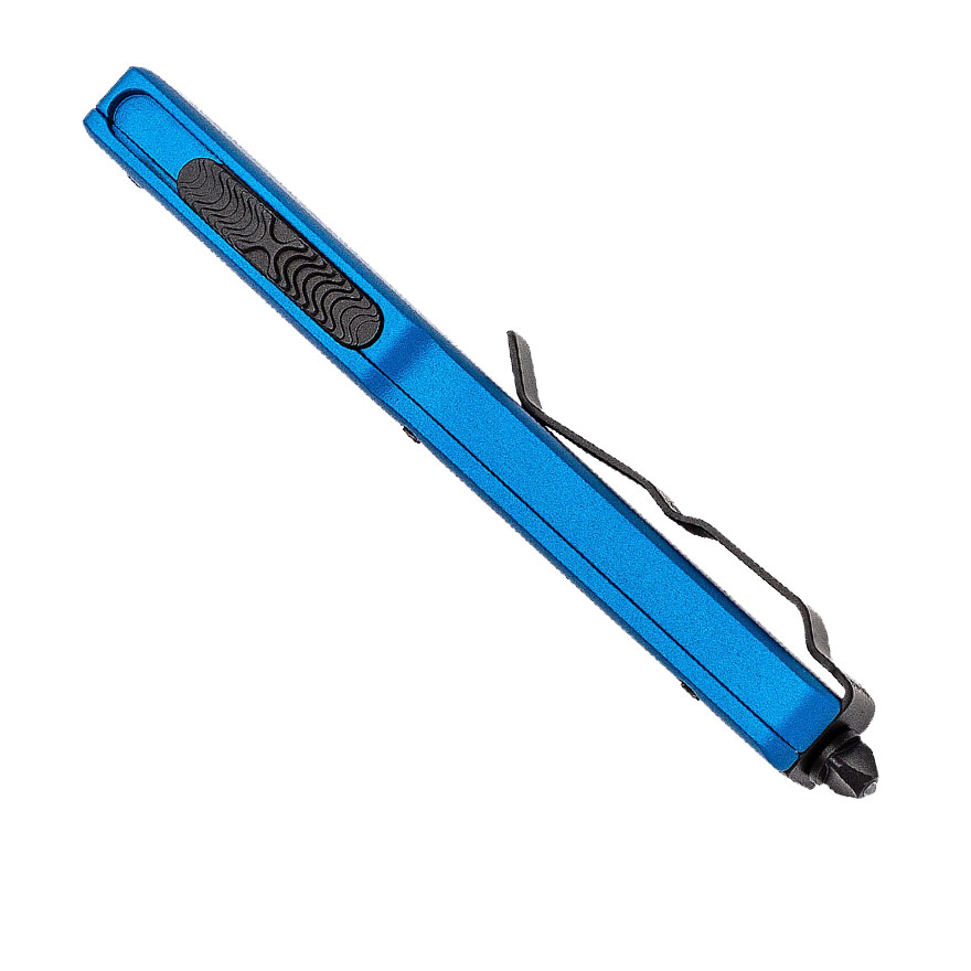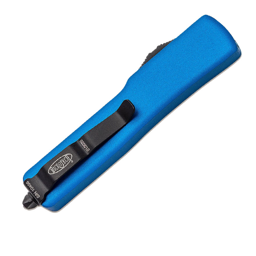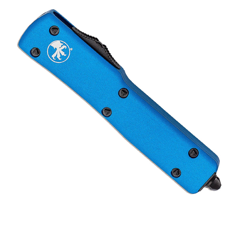 Microtech – 148-2BL – UTX-70 – OTF Auto – Elmax, M390, 204P Coated Drop Point – 6061-T6 Aluminum – Blue