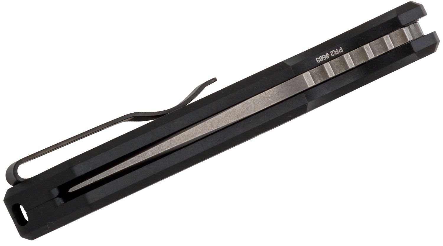 Pro-Tech Knives is proud to be the first choice of Police and Military professionals around the world. Pro-Tech Knives are built to serve and serve well. The Short Bladed Rockeye, or SBR for short, is a compact version of the outstanding full-sized Rockeye Auto. Both knives are designed by Marine Corps knife designer Les George, who’s ergonomic hard use knives have been faithfully translated to automatic versions by Pro-Tech. The SBR features a compact design, with a 2.5″ blade that’s built for a multitude of cutting tasks. A pocket milled spine adds extra grip and depth to the design. The knife snaps open with authority thanks to Pro-Tech’s coil spring automatic mechanism. Don’t let its size fool you, the SBR is a bantam powerhouse. This model features solid black hard coat anodized handles, blasted hardware, a black DLC coated deep carry pocket clip, and an stonewashed blade finish.