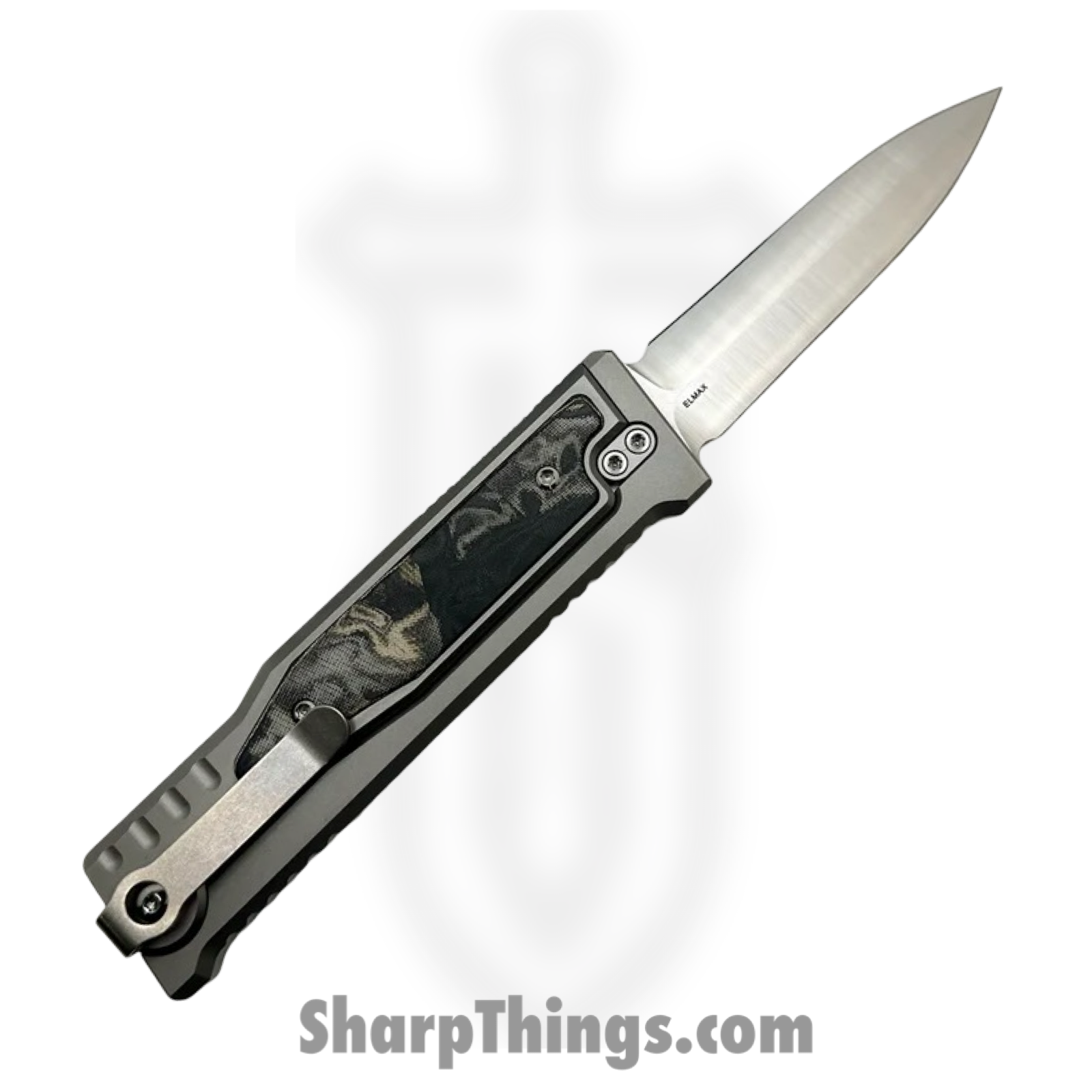 Reate Knives – EXO2121ELMI – EXO-M – Gravity Knife – ELMAX Satin Dagger – Titanium Burl Linen Micarta Inlay – Gray Black Green