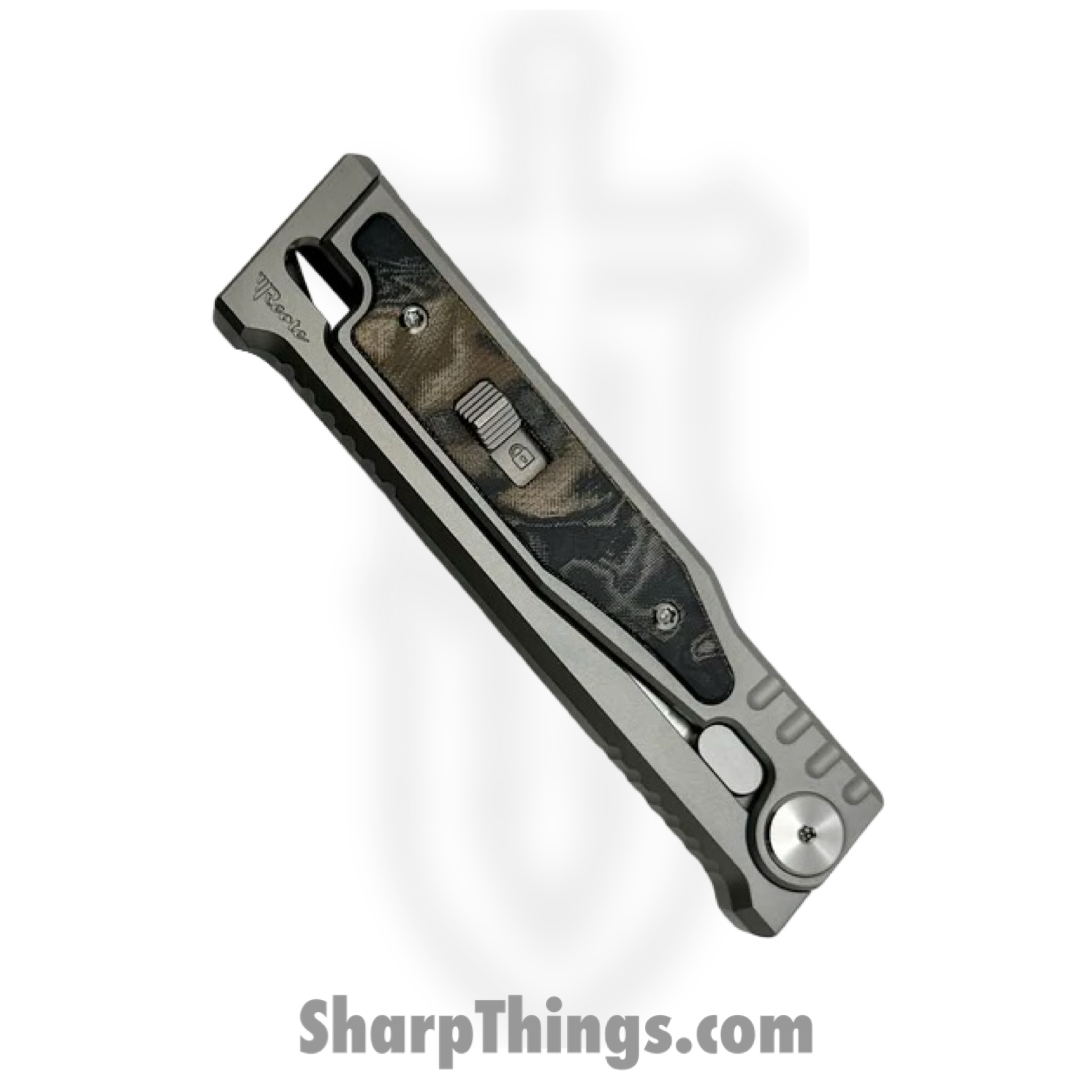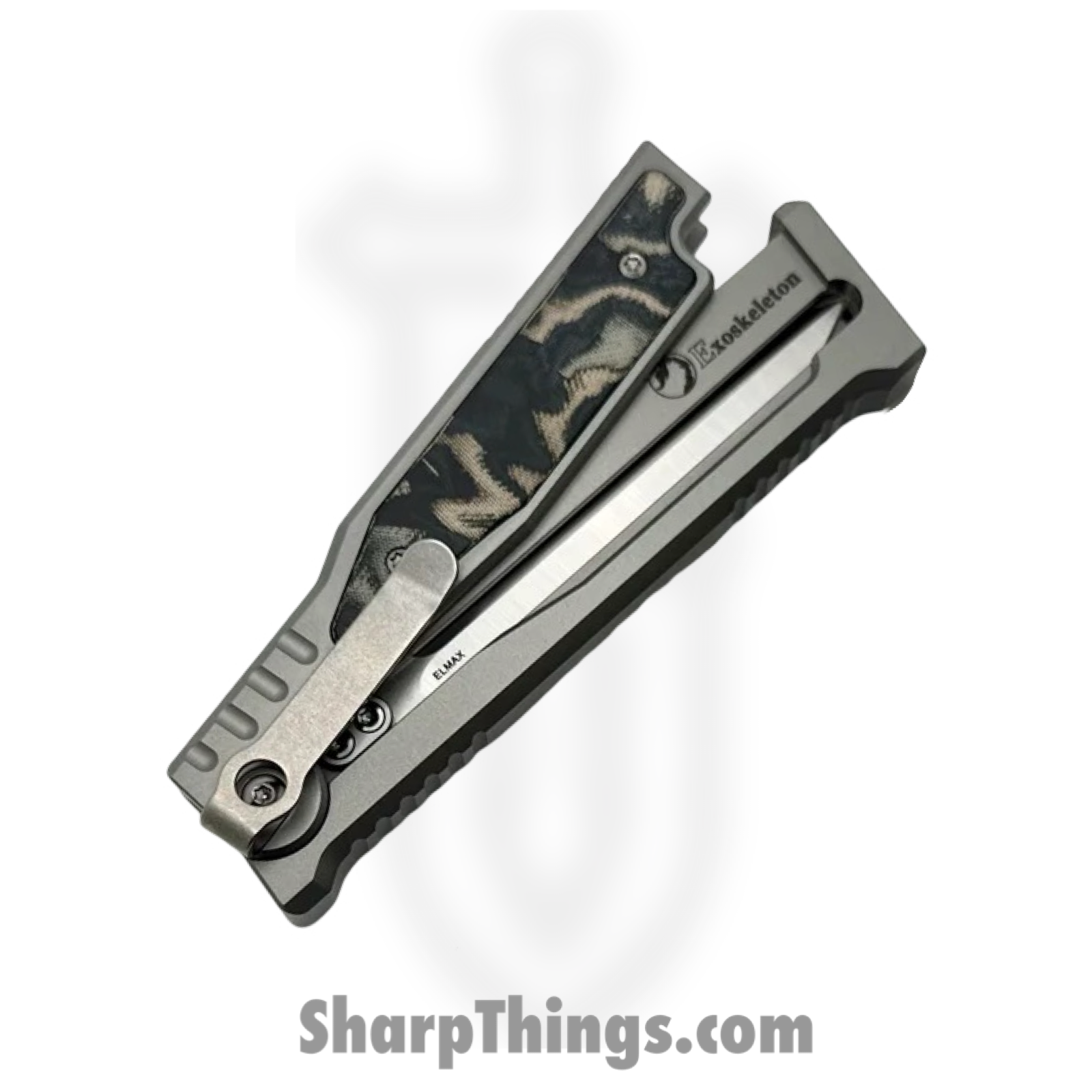 The Reate Knives EXO-M elevates gravity-style folding knives with meticulous engineering and premium materials. Designed to marry reliability with an enticing tactile experience, this variant of the EXO-M sports a refined mechanism, compact dimensions, and a refined aesthetic tailored for discerning users. Drawing from multiple trusted sources, this knife features a robust 2.95-inch blade crafted from Elmax powder steel, renowned for its outstanding edge retention, toughness, and corrosion resistance. Blade thickness stands at approximately 0.118 inches. The dagger/double edge blade comes with a satin finish. The deployment system relies on a pivoted, out-the-front gravity mechanism, where a simple pinch of the scales and angle adjustment allow the blade to slide out effortlessly—offering both practicality and an engaging fidget factor. Safety is enhanced via a robust safety or slide-lock, ensuring secure handling when the blade is open or closed. The handle blends bead-blasted titanium with burl linen Camouflage Micarta or optionally green/black burl linen Micarta inlays. This combination provides durability, aesthetic appeal, and a tactile grip. Dimensions include a closed length around 4.33 inches (handle length) or 4.5 inches overall closed. The overall length when open reaches approximately 7.48 inches. Despite its sturdy feel, the knife weighs in at just 4.3 ounces, ensuring comfortable everyday carry. Additional enhancements include a tip-down titanium pocket clip (often paired with a leather slip or backing) for discreet and secure carry. Finally, this EXO-M boasts the outstanding craftsmanship for which Reate Knives is known.