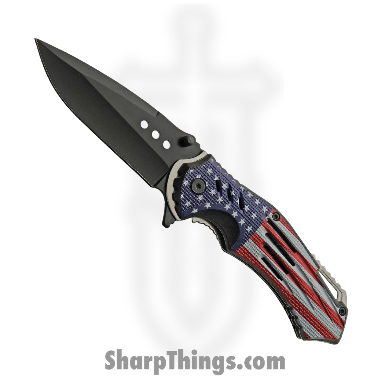 Assisted opening. 4.75″ (12.07cm) closed. 3.5″ (8.89cm) black finish stainless blade. Textured ABS handle. Extended tang. Thumb stud. Lanyard hole. Pocket clip. American flag handle artwork. Boxed.