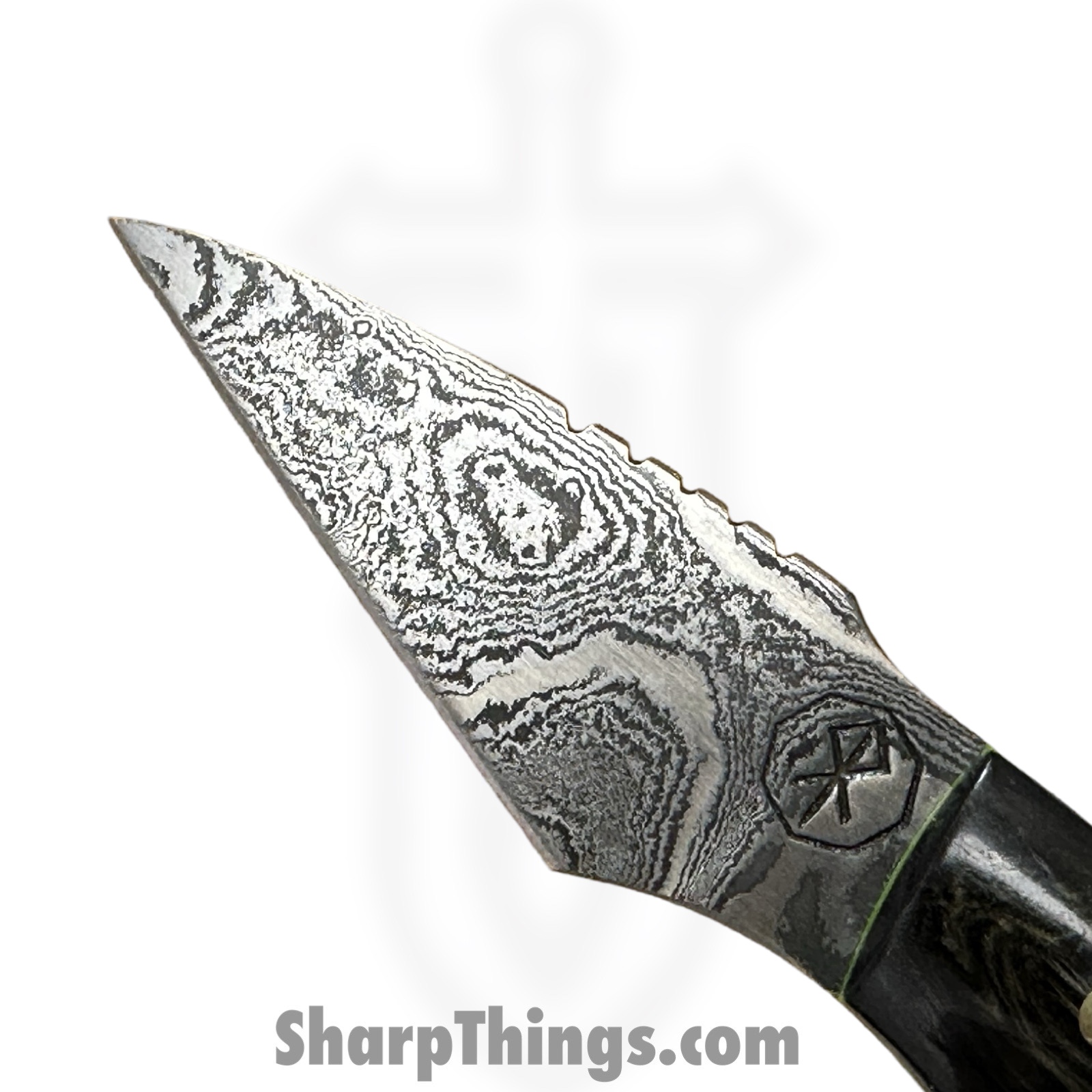 Royalty Rings Co. – RRC-Nyx-14 – Nyx – Fixed Blade Knife – Baker Forge Icestorm Wavy Damascus Kiridashi – Resin – Black / Gold / Green