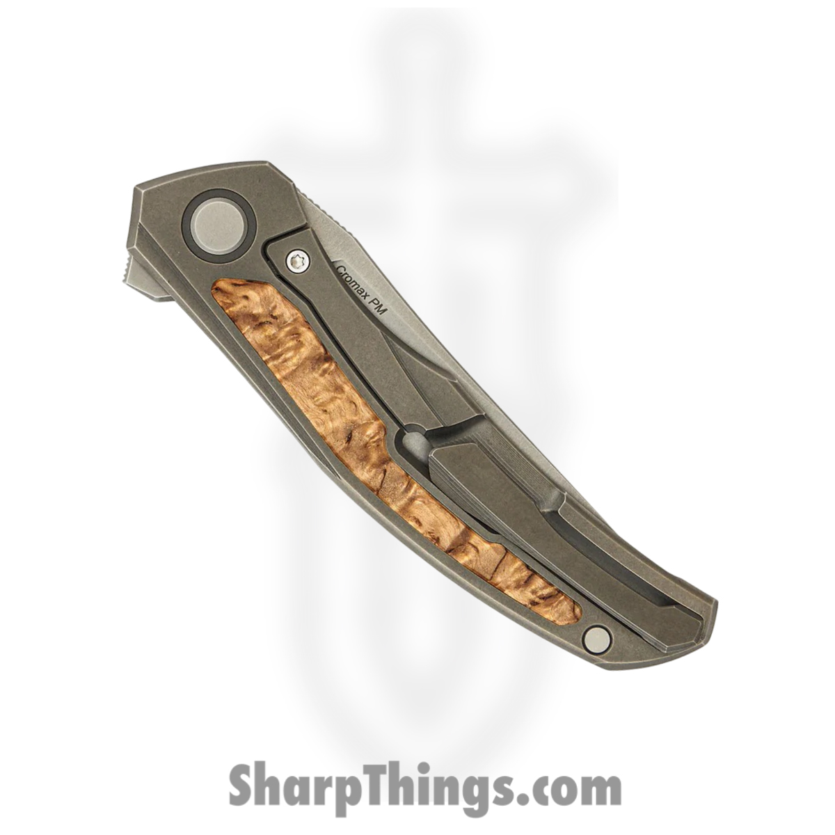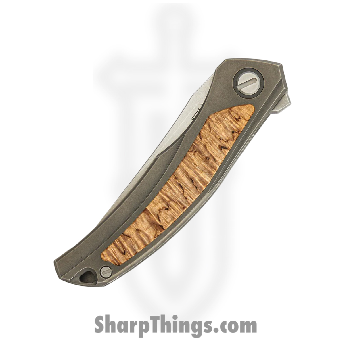 Shirogorov Knives – SHI-URS-QNL-CB – Ursus Quantum – Folding Knife – Cromax PM Stonewash Upswept – Titanium Curly Birch Inlay – Grey Brown