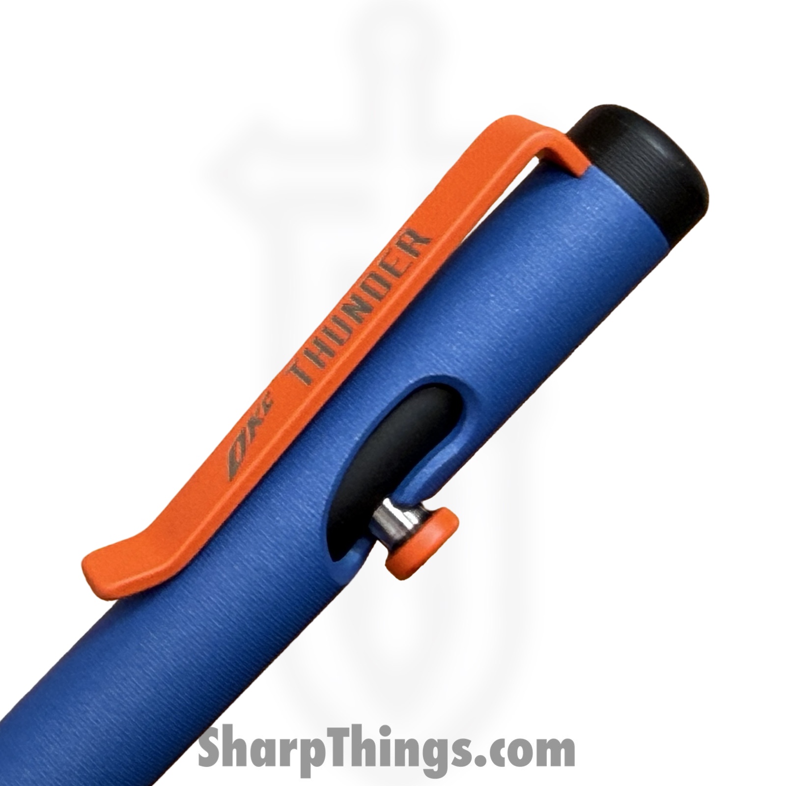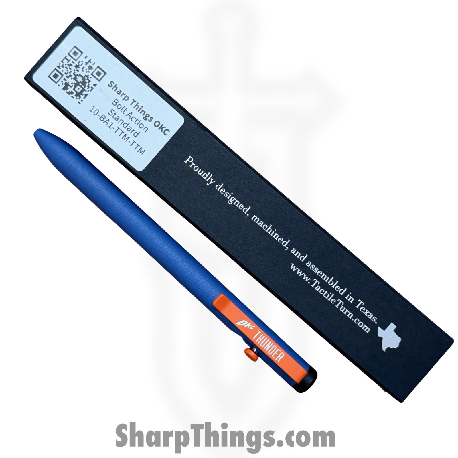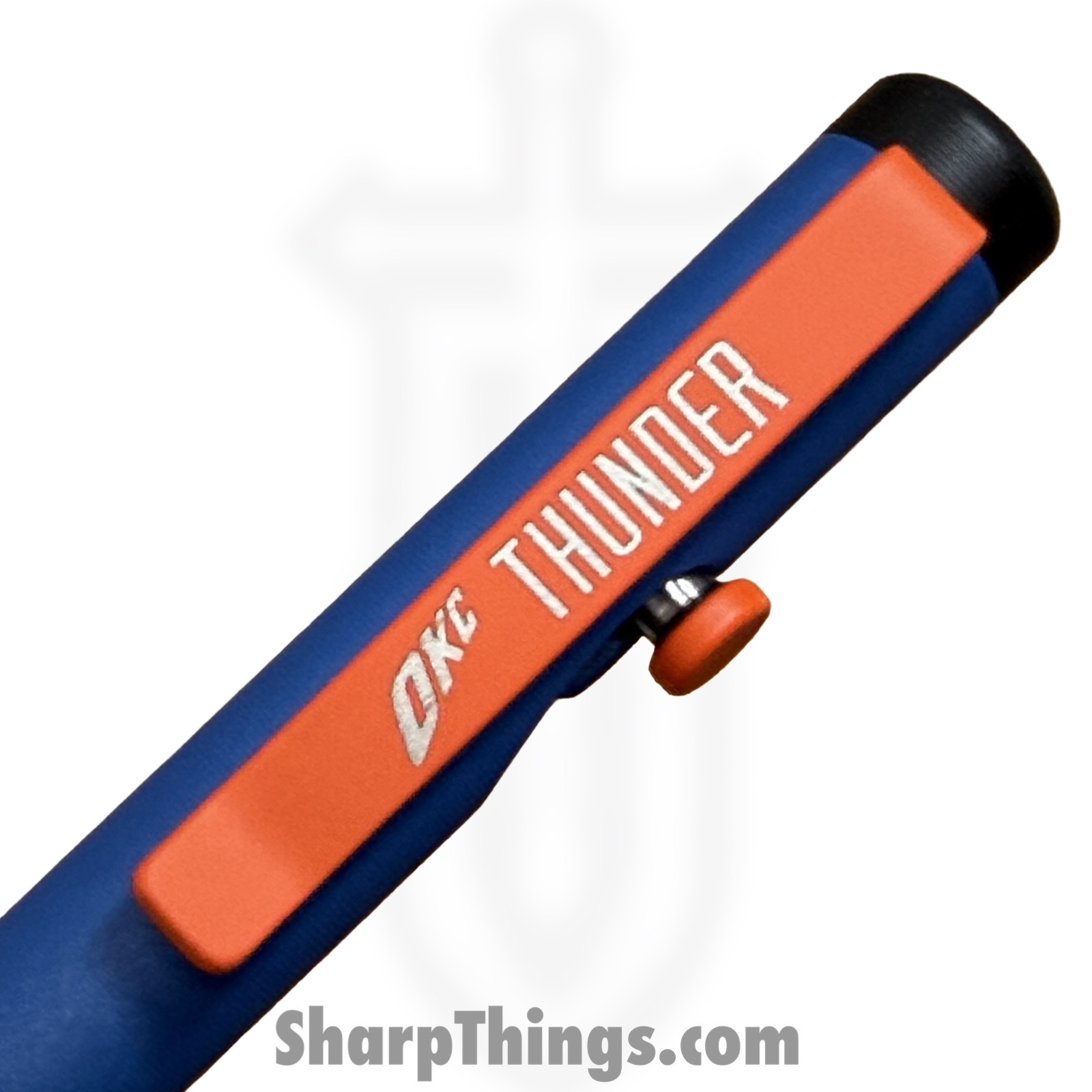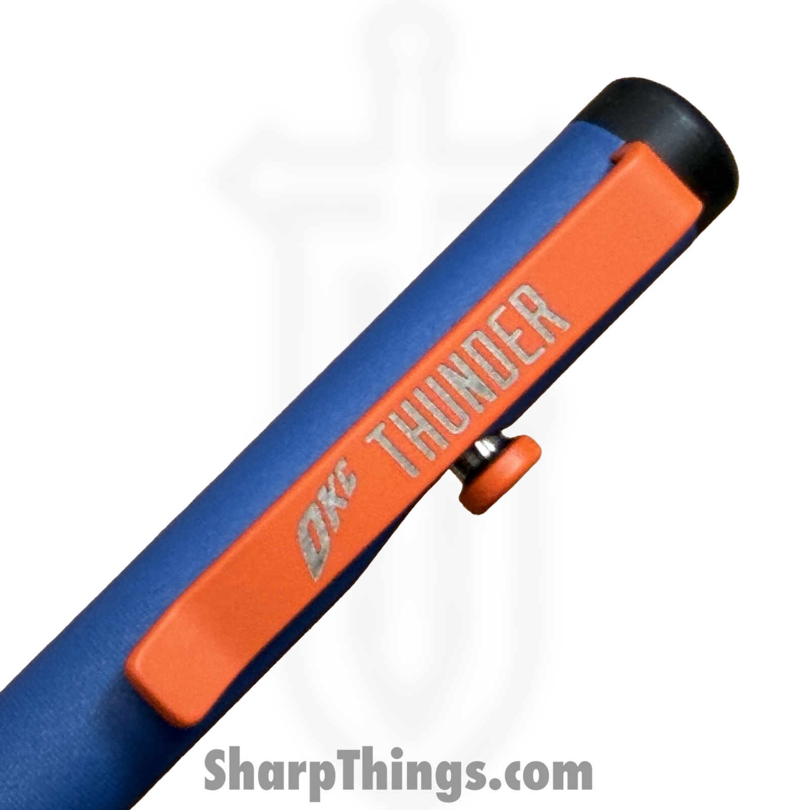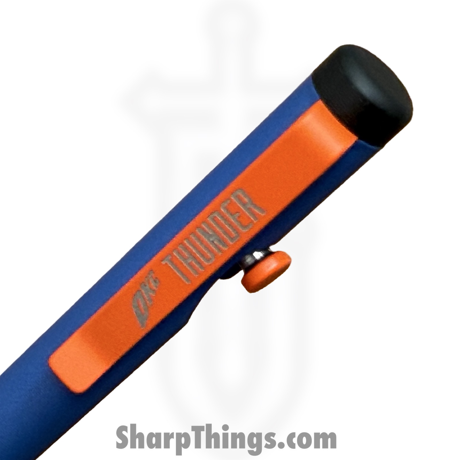 Sharp Things Exclusive! The Tactile Turn TT-OKC-001 OKC Thunder Bolt Action Standard Pen in Blue / Orange Cerakote is a premium exclusive writing instrument that combines exceptional craftsmanship with a sleek, modern design all while promoting the 2025 Nation NBA Champions! Designed for both functionality and style, this pen is an excellent choice for professionals and enthusiasts alike. The pen features a Slate Cerakote colorway, providing a sophisticated and durable finish. Cerakote is a thin ceramic coating known for its resistance to abrasion, chemicals, temperatures, and scratches. Equipped with a robust bolt action mechanism, the pen ensures a smooth and satisfying writing experience. The mechanism allows for one fluid motion to advance or retract the refill, with meticulously machined internal surfaces for enhanced smoothness. The pen includes a stainless steel deep-carry clip, providing secure attachment to pockets or notebooks for convenient portability.