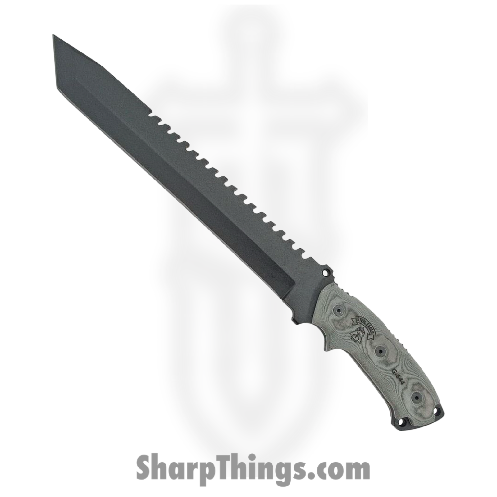 16″ overall. 11″ black traction coated 1095 carbon steel blade with sawback. Full tang. Black linen micarta handles. Lanyard hole. Black combat ballistic nylon belt clip sheath. Made in the USA.