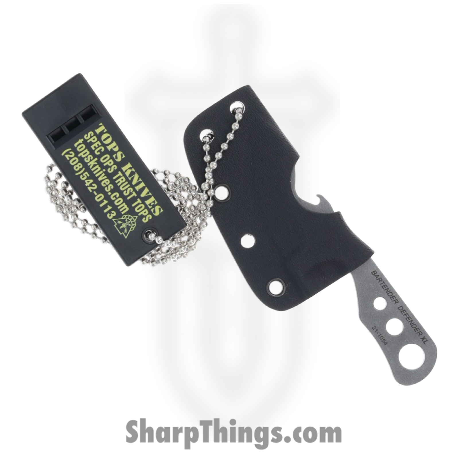 The Bartender Defender XL is a follow up to TOPS’ very popular Bartender Defender. This model was made thanks to specific customer feedback. Many liked that the original was extra small and lightweight, but wanted a slightly longer blade to work with. Don’t let the “XL” fool you. This new model is still less than 5.5” long when it’s sheathed, but has a blade over 2” long. Another update is that the bottle opener is accessible without having to remove the knife from the sheath. TOPS went with a smooth and attractive tumble finished 1095 blade with a clear Cerakote to protect from rust. The Bartender Defender XL is an excellent choice for those who are constantly opening boxes and/or brews.
