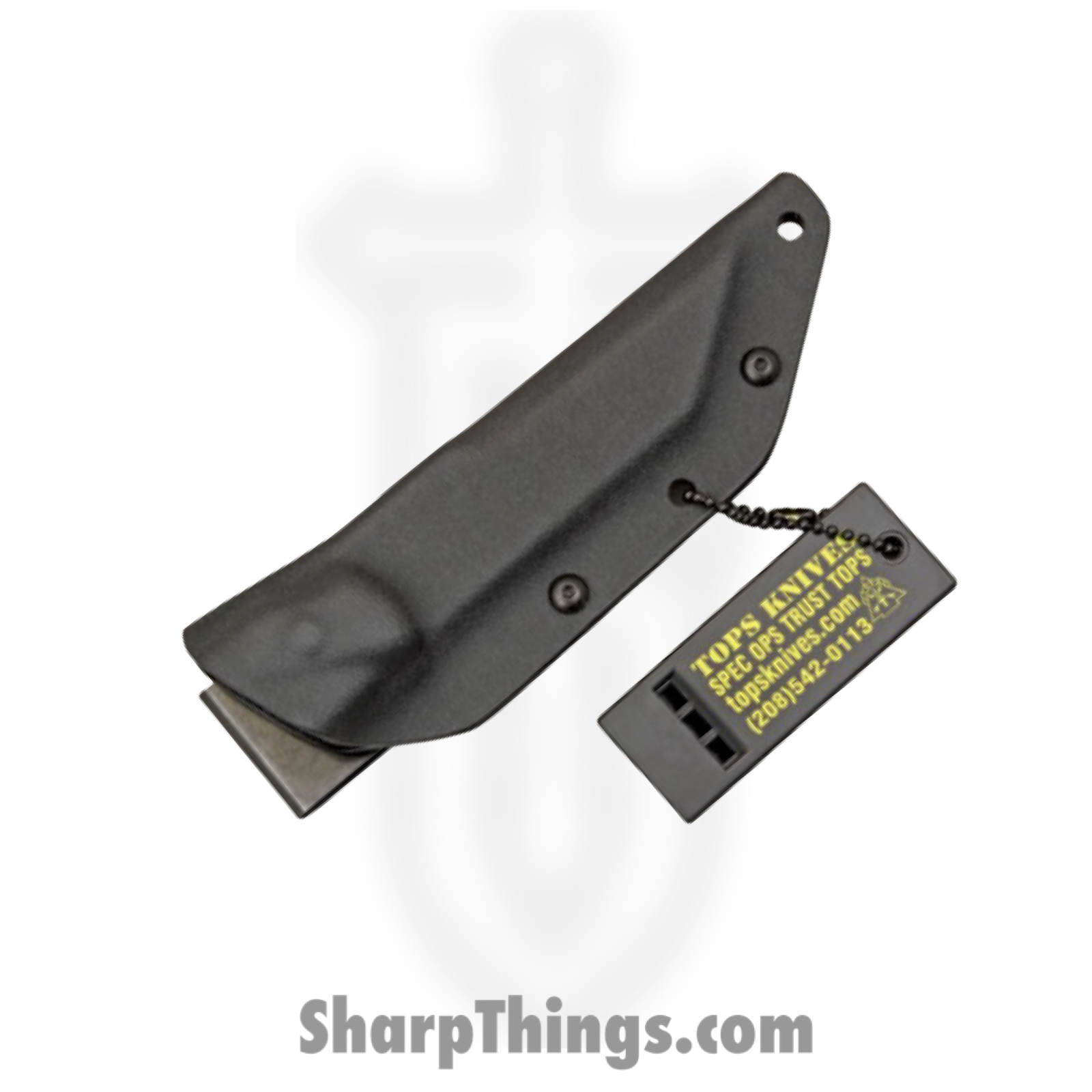 Engineered for aggressive performance and uncompromising durability, the TOPS Back Bite (Model # TPBBITE01, also known in some markets as “BKBT-01”) is a fixed-blade tactical/combat knife designed by Colin Despins to combine unique edge geometry with rugged construction. Crafted in the USA, this knife delivers strike, trap, attack, and defense capabilities in one tool. The Back Bite features a dramatic, forward-and-reverse striking design. Its blade includes a concave strike face edge on one side and a Wharncliffe-style back edge, creating the ability to inflict damage both “forward” and “back.” The blade point is flat (chisel-style), and the bottom and top edges are sharpened to give added utility during defensive work. The handle consists of gray linen micarta onlays over its one-piece full tang 1095 carbon steel body, offering solid grip even under adverse conditions. It is protected by a black traction coating on the blade, enhancing resistance to corrosion and glare. A custom black Kydex sheath is included, fitted with a rotating spring-steel clip for secure carry. The knife package also ships with a TOPS emergency whistle, attached via a black beaded chain lanyard to the sheath.