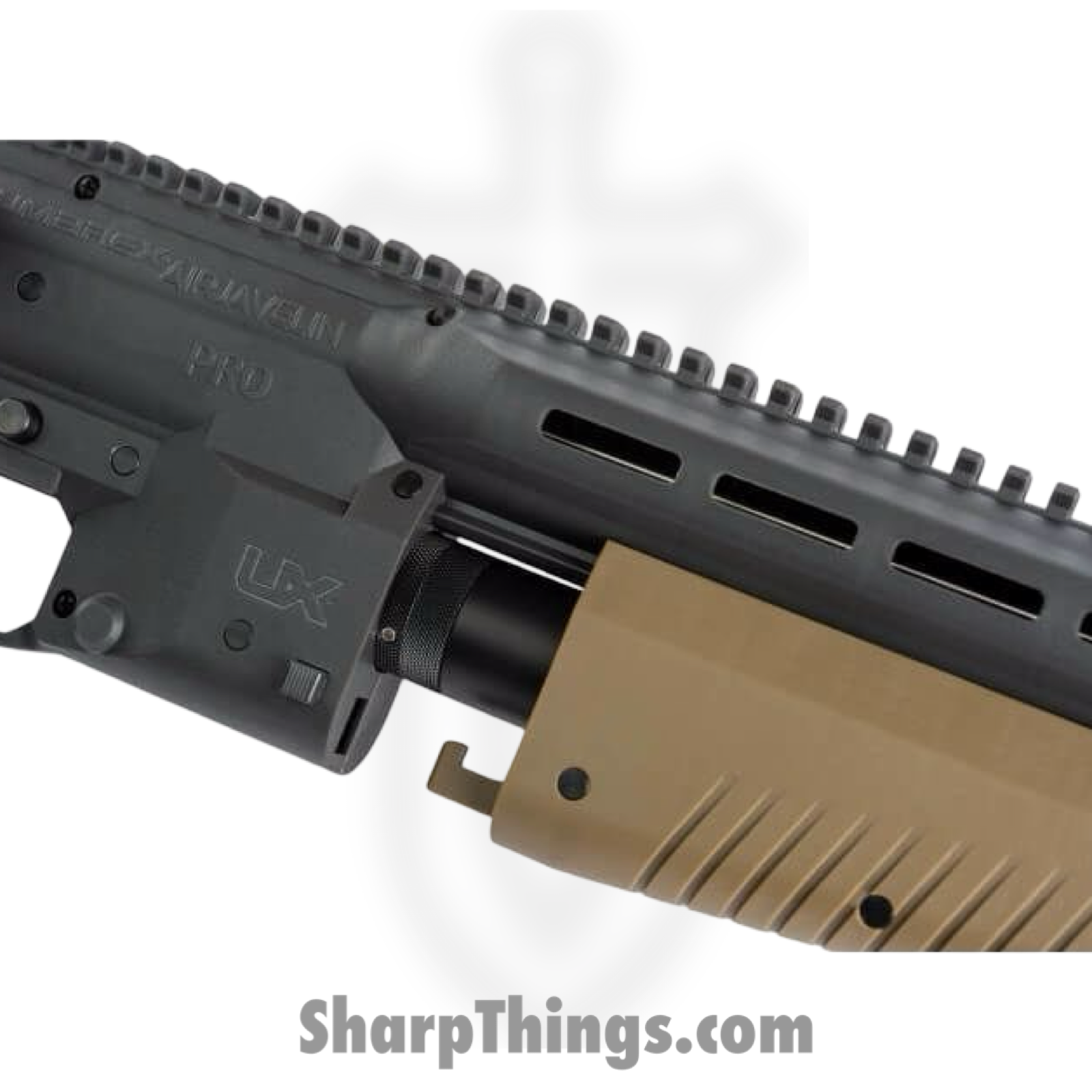 The world’s most fun air archery gun just got more–More Velocity, More Power, More Air! The Umarex AirJavelin Pro adds pro-level features to the original AirJavelin platform to create a compact, lightweight, and surprisingly powerful pneumatic arrow launching device. The AirJavelin Pro is powered by an onboard 7.4 cubic inch tank that accepts a maximum fill volume of 4,500 psi. This tank is regulated at 1,500 psi which leaves 25 effective shots. Expect 15 full power shots before the pressure drops below the regulator limit. Arrows will launch at 370 FPS and generate 52 ft-lbs of energy. No fill probe is needed as the tank is fitted with a male Foster-style quick connect fitting on the end and optics can be attached to the generous Picatinny rail section on top of the gun. M-LOK accessories are also easily attached to the M-LOK slots found on either side of the barrel.