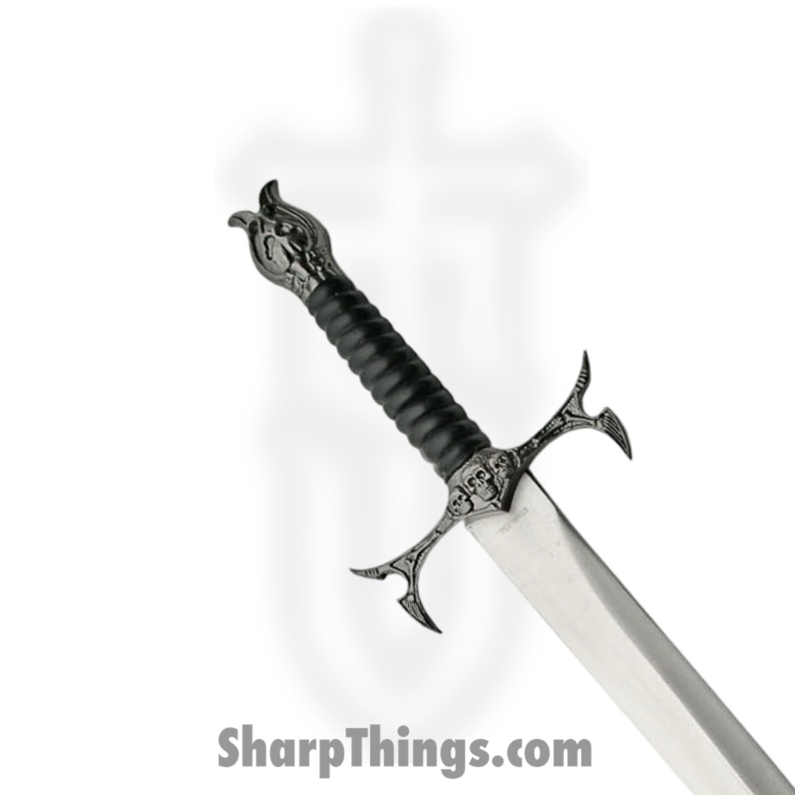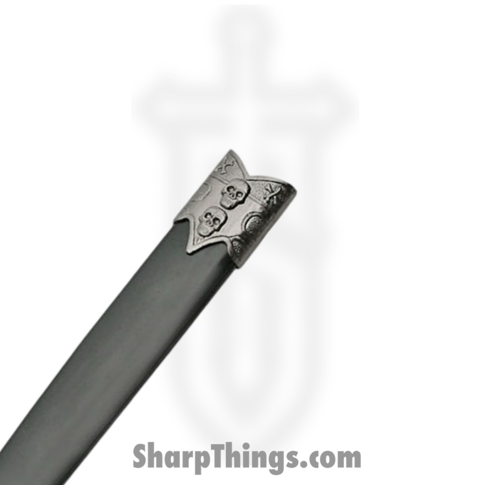 Scabbard: Matching silver and black scabbard featuring skull accents