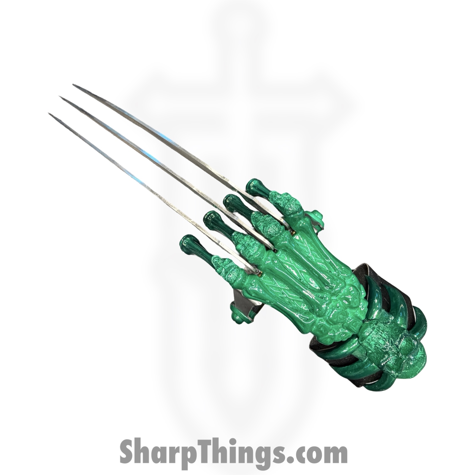The VOC HK-1551-GN Death Skull Claw brings the same intense fantasy styling as the blue model but adds a vivid green accent that makes the design pop with even more dramatic flair. Featuring stainless steel display-grade claws mounted into a sculpted ABS skull handle, this piece is intended primarily for fantasy collections, cosplay, wall display, or decorative roleplay environments. The claws maintain the iconic triple-blade configuration that gives the piece its intimidating shape while keeping weight low for comfortable handling and safe display. Although made from stainless steel, the claws are not built for heavy impact and should be treated as a collector’s piece rather than a functional striking tool.