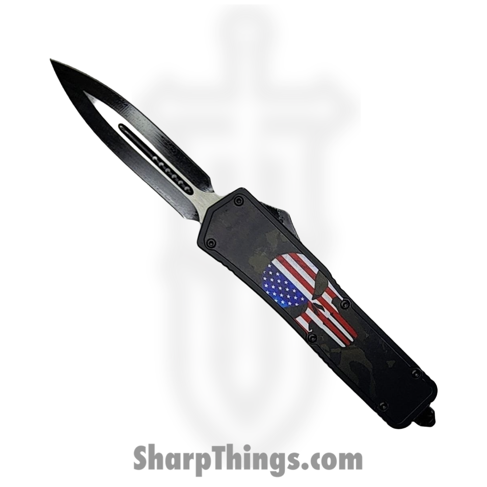 Large American Flag Punisher – OTF Auto – 440 SS Two Tone Dagger – Aluminum – Black/Red/White/Blue